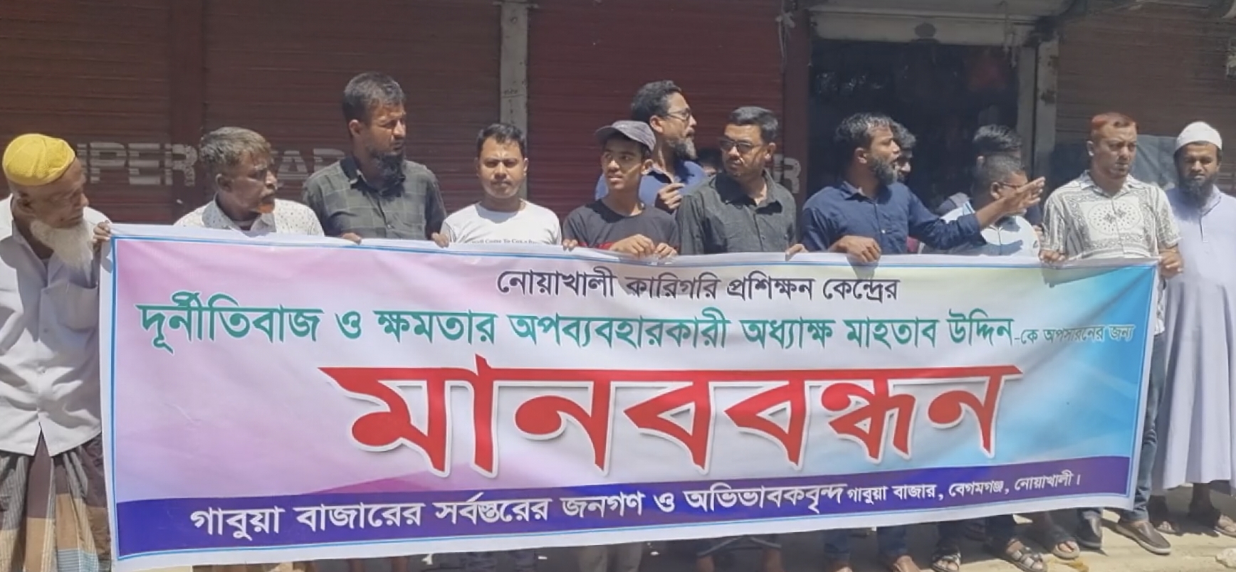 মঙ্গলবার (১২ মার্চ) দুপুর ১২টায় নোয়াখালীর গাবুয়া উপ-শহরে নোয়াখালী কারিগরি প্রশিক্ষণ কেন্দ্রের অধ্যক্ষ মাহতাব উদ্দিন পাটওয়ারির অপসারণের দাবিতে আয়োজিত মানববন্ধনে এমনটাই বলেছেন, অভিভাবক ও স্থানীয় এলাকাবাসী।