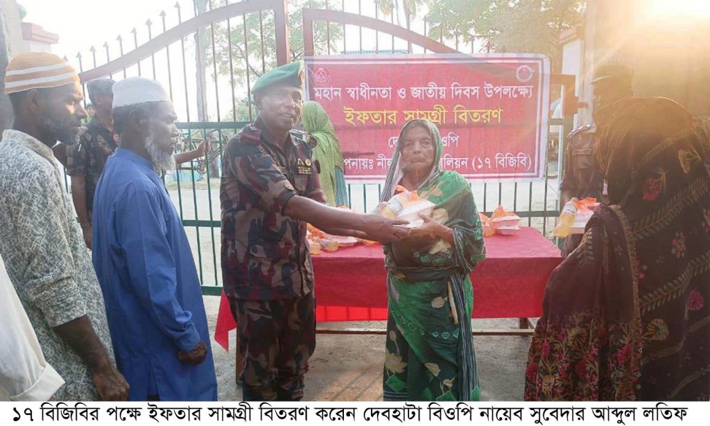 মহান স্বাধীনতা ও জাতীয় দিবস উপলক্ষ্যে দেবহাটায় বিজিবি’র পক্ষ থেকে ইফতার সামগ্রী বিতরণ করা হয়েছে। সোমবার (১ এপ্রিল) সীমান্তরক্ষী বাহিনী বর্ডার গার্ড বাংলাদেশ (বিজিবি) নীলডুমুর ১৭ ব্যাটালিয়নের আয়োজনে দেবহাটা ক্যাম্পে এ ইফতার সামগ্রী প্রদান করা হয়। ১৭ বিজিবির পক্ষে দেবহাটা বিওপি নায়েব সুবেদার আব্দুল লতিফ গরীব অসহায় মানুষের হাতে এ সামগ্রী তুলে দেন। তিনি জানান, বর্ডার গার্ড বাংলাদেশ (বিজিবি) সদস্যরা শুধু দেশের সীমান্ত রক্ষায় কাজ করে না। দেশ ও জাতির কল্যাণে বিভিন্ন আতœমানবেতর সেবা বিভিন্ন কর্মসূচি বাস্তবায়ন করে আসছে। তারই অংশ হিসাবে মহান স্বাধীনতা ও জাতীয় দিবস উপলক্ষ্যে ১৭ বিজিবি’র পক্ষে বিভিন্ন ক্যাম্পে সীমান্ত পাড়ের মানুষের মুখে একটু হাসি ফোঁটাতে ইফতার সামগ্রী প্রদান করা হয়েছে। দেবহাটা ক্যাম্পের আশেপাশের গরীব, অসহায় ও প্রবীণ ৩৫ জন নারী পুরুষের হাতে এসব ইফতার সামগ্রী তুলে দিতে পেরে সন্তোষ প্রকাশ করেন তিনি।