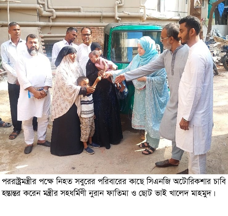 পররাষ্ট্রমন্ত্রীর পক্ষে নিহত সবুরের পরিবারের কাছে সিএনজি অটোরিকশার চাবি হস্তান্তর করেন মন্ত্রীর সহধর্মিণী নুরান ফাতিমা ও ছোট ভাই খালেদ মাহমুদ
