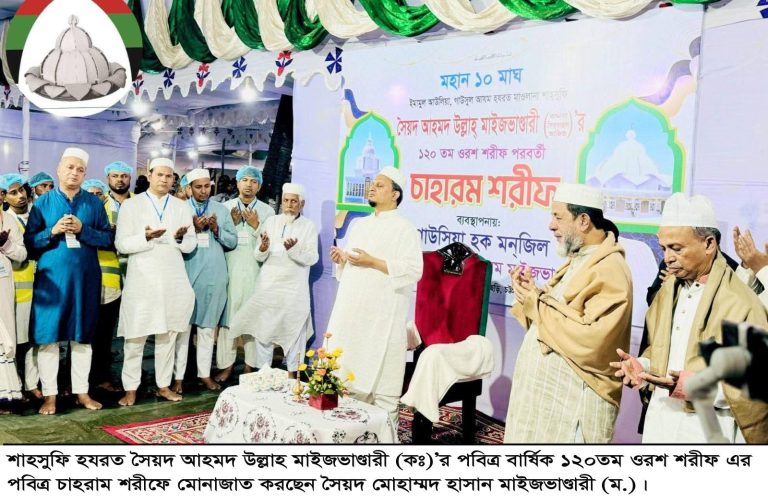 বাংলাদেশকে একটি শান্তির ও নিরাপদ জনপদ হিসেবে কবুল করার জন্য মহান আল্লাহর দরবারে ফরিয়াদ জানিয়েছেন মাইজভাণ্ডার শরীফ গাউসিয়া হক মনজিল এর সম্মানিত সাজ্জাদানশীন রাহবারে আলম হযরত সৈয়দ মোহাম্মদ হাসান মাইজভাণ্ডারী (ম.)।গতকাল শনিবার দিবাগত মধ্যরাতে চট্টগ্রামের ফটিকছড়ি মাইজভাণ্ডার দরবার শরীফে গাউসুল আযম হযরত মাওলানা শাহ্সূফি সৈয়দ আহমদ উল্লাহ্ মাইজভাণ্ডারী (ক.)-এর ১২০তম বার্ষিক উরস্ শরীফের আখেরি মোনাজাতে মহান আল্লাহর কাছে তিনি উক্ত ফরিয়াদ করেন।