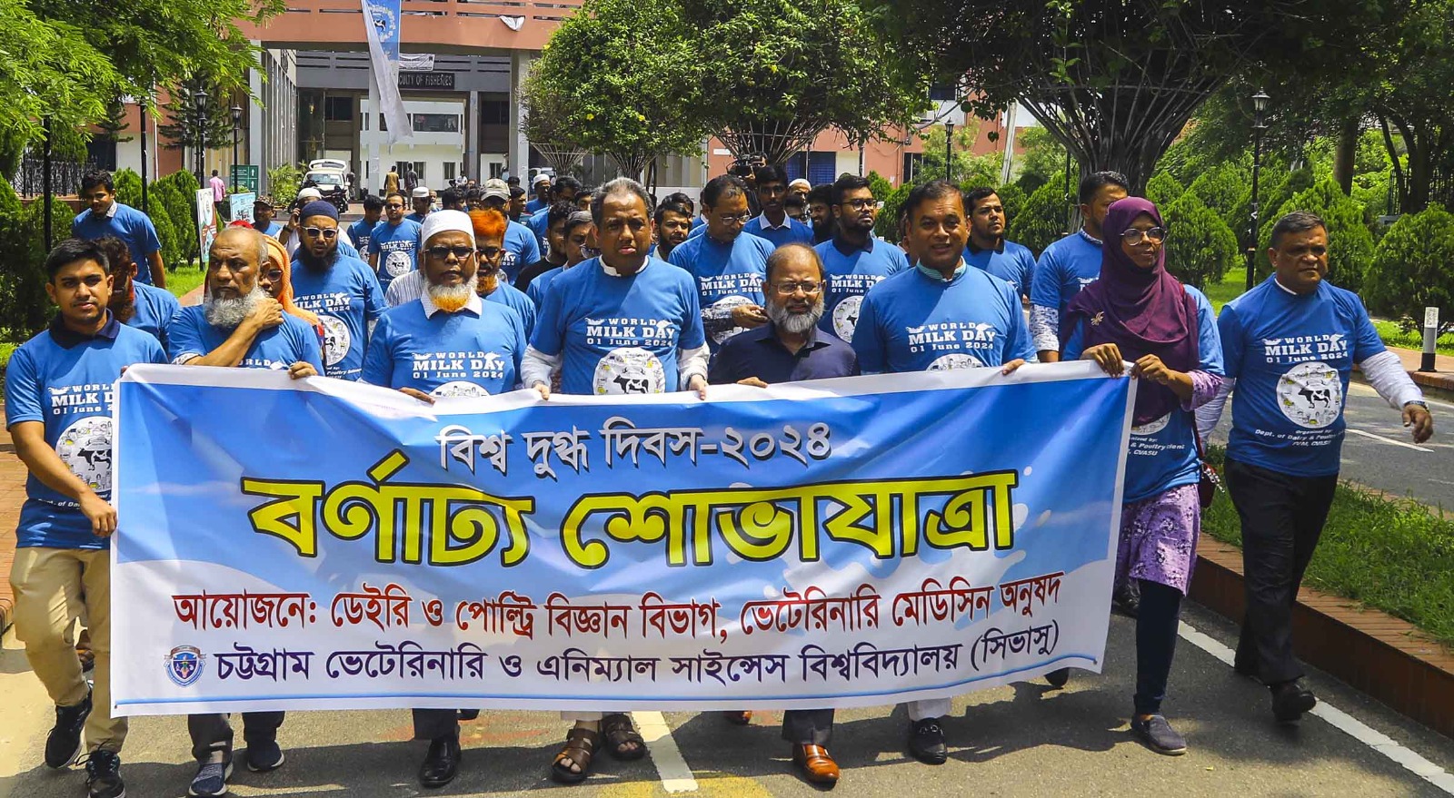 চট্টগ্রাম ভেটেরিনারি ও এনিম্যাল সাইন্সেস বিশ^বিদ্যালয়ে (সিভাসু) নানা কর্মসূচির মধ্য দিয়ে ‘বিশ্ব দুগ্ধ দিবস-২০২৪’ উদ্যাপন করা হয়েছে। গতকাল শনিবার সিভাসু’র ডেইরি ও পোল্ট্রি বিজ্ঞান বিভাগের উদ্যোগে দিবসটি উদ্যাপন করা হয়। এ উপলক্ষে সকাল ১০টায় বিশ^বিদ্যালয় ক্যাম্পাসে বের করা হয় বর্ণাঢ্য শোভাযাত্রা। শোভাযাত্রায় নেতৃত্ব দেন সিভাসু’র উপাচার্য প্রফেসর ড. এএসএম লুৎফুল আহসান। এতে বিশ^বিদ্যালয়ের শিক্ষার্থী, শিক্ষক, কর্মকর্তা ও কর্মচারীরা অংশগ্রহণ করেন। শোভাযাত্রা শেষে সিভাসু অডিটোরিয়ামে অনুষ্ঠিত হয় ‘দুগ্ধ পান’ কর্মসূচি। এরপর সিভাসু অডিটোরিয়ামে অনুষ্ঠিত হয় সেমিনার ও আলোচনাসভা।