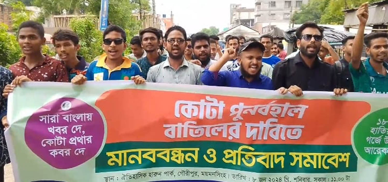 হাইকোর্ট কর্তৃক প্রথম ও দ্বিতীয় শ্রেণির সরকারি চাকরিতে কোটা পুনর্বহাল আদেশের বিরুদ্ধে ময়মনসিংহের গৌরীপুরের সর্বস্তরের ছাত্র সমাজের ব্যানারে মানববন্ধন ও প্রতিবাদ সমাবেশ অনুষ্ঠিত হয়েছে।