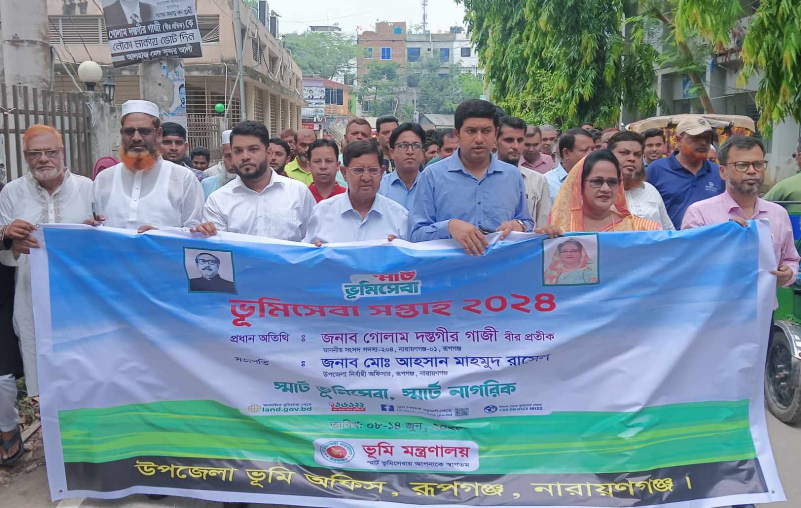 নারায়ণগঞ্জের রূপগঞ্জে ভূমিসেবা সপ্তাহ উপলক্ষে আলোচনা সভা ও র্যালী করা হয়েছে। গতকাল ৮ জুন শনিবার রূপগঞ্জ উপজেলা পরিষদ কমপ্লেক্সে থেকে র্যালীটি বের করে উপজেলা পরিষদের আশপাশের সড়ক প্রদক্ষিণ করে। পরে উপজেলা পরিষদের সভা কক্ষে আলোচনা সভা হয় অনুষ্ঠিত হয় । উপজেলা ভূমি অফিস আয়োজিত সভায় সভাপতিত্ব করেন রূপগঞ্জ উপজেলা নির্বাহী অফিসার আহসান মাহমুদ রাসেল। সভায় বক্তব্য রাখেন নারায়ণগঞ্জ-১ রূপগঞ্জ সংসদ সদস্য গোলাম দস্তগীর গাজী বীর প্রতীক, উপজেলা সহকারী কমিশনার (ভূমি) সিমন সরকার, উপজেলা পরিষদের ভারপ্রাপ্ত চেয়ারম্যান সৈয়দা ফেরদৌসী আলম নীলা, নবনির্বাচিত চেয়ারম্যান হাবিবুর রহমান হাবিব, রূপগঞ্জ উপজেলার প্রেসক্লাবের সাধারণ সম্পাদক মকবুল হোসেন প্রমূখ।