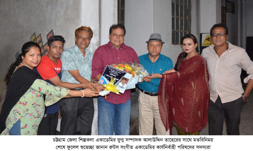 চট্টগ্রাম জেলা শিল্পকলা একাডেমির কার্যনির্বাহী কমিটির নির্বাচনে যুগ্ম সম্পাদক পদে নির্বাচিত কণ্ঠশিল্পী, সুরকার, সংগীত পরিচালক আলাউদ্দিন তাহেরের সাথে রুটস সংগীত একাডেমির মতবিনিময় অনুষ্ঠিত হয়। একাডেমির পরিচালক জগলুল পাশার সভাপতিত্বে মতবিনিময়কালে জেলা শিল্পকলা একাডেমির নবনির্বাচিত যুগ্ম সম্পাদক আলাউদ্দিন তাহেরকে ফুল দিয়ে শুভেচ্ছা জানানো হয়। এ সময় উপস্থিত ছিলেন, বাংলাদেশ বেতার ও টেলিভিশনের কণ্ঠশিল্পী শহীদ ফারুকী, সংগীতশিল্পী জানে আলম জনি, শিমুল আক্তার, শিউলি সাহা, যন্ত্রশিল্পী অনিমেষ কর প্রমুখ।