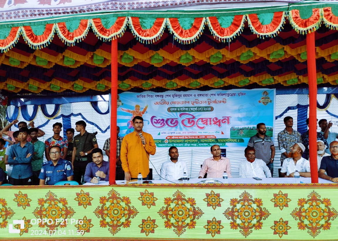 ময়মনসিংহ নান্দাইলে চন্ডীপাশা সরকারি উচ্চ বিদ্যালয়ের খেলার মাঠে (৪ জুলাই) বৃহস্পতিবার সকাল ১০ ঘটিকায় উপজেলা প্রশাসনের আয়োজনে, নান্দাইল উপজেলা ক্রীড়া সংস্থার সার্বিক সহযোগিতায় জাতির পিতা বঙ্গবন্ধু শেখ মুজিবুর রহমান ও বঙ্গমাতা শেখ ফজিলাতুন্নেছা মুজিব জাতীয় গোল্ডকাপ ফুটবল টুর্নামেন্ট-২০২৪ (বালক-বালিকা) অনূর্ধ্ব-১৭ এর শুভ উদ্বোধন করা হয়।