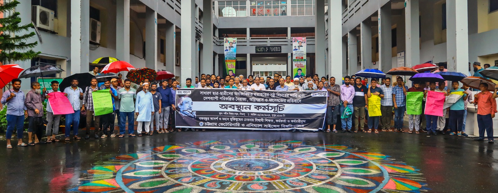 কোটা সংস্কার আন্দোলনকে কেন্দ্র করে সাধারণ ছাত্রছাত্রীদের অনাকাক্সিক্ষত হতাহতের সুষ্ঠু বিচারের দাবি এবং দেশব্যাপী পরিকল্পিত নৈরাজ্য, অগ্নিসন্ত্রাস ও ধ্বংসযজ্ঞের প্রতিবাদে অবস্থান কর্মসূচি পালন করেছেন বঙ্গবন্ধুর আদর্শ ও মহান মুক্তিযুদ্ধের চেতনায় বিশ^াসী চট্টগ্রাম ভেটেরিনারি ও এনিম্যাল সাইন্সেস বিশ^বিদ্যালয়ের (সিভাসু) শিক্ষক, কর্মকর্তা ও কর্মচারীবৃন্দ। গতকাল বৃহস্পতিবার বেলা ১২টায় বিশ^দ্যিালয়ের শহীদ মিনার চত্বরে তাঁরা এ কর্মসূচি পালন করেন।
