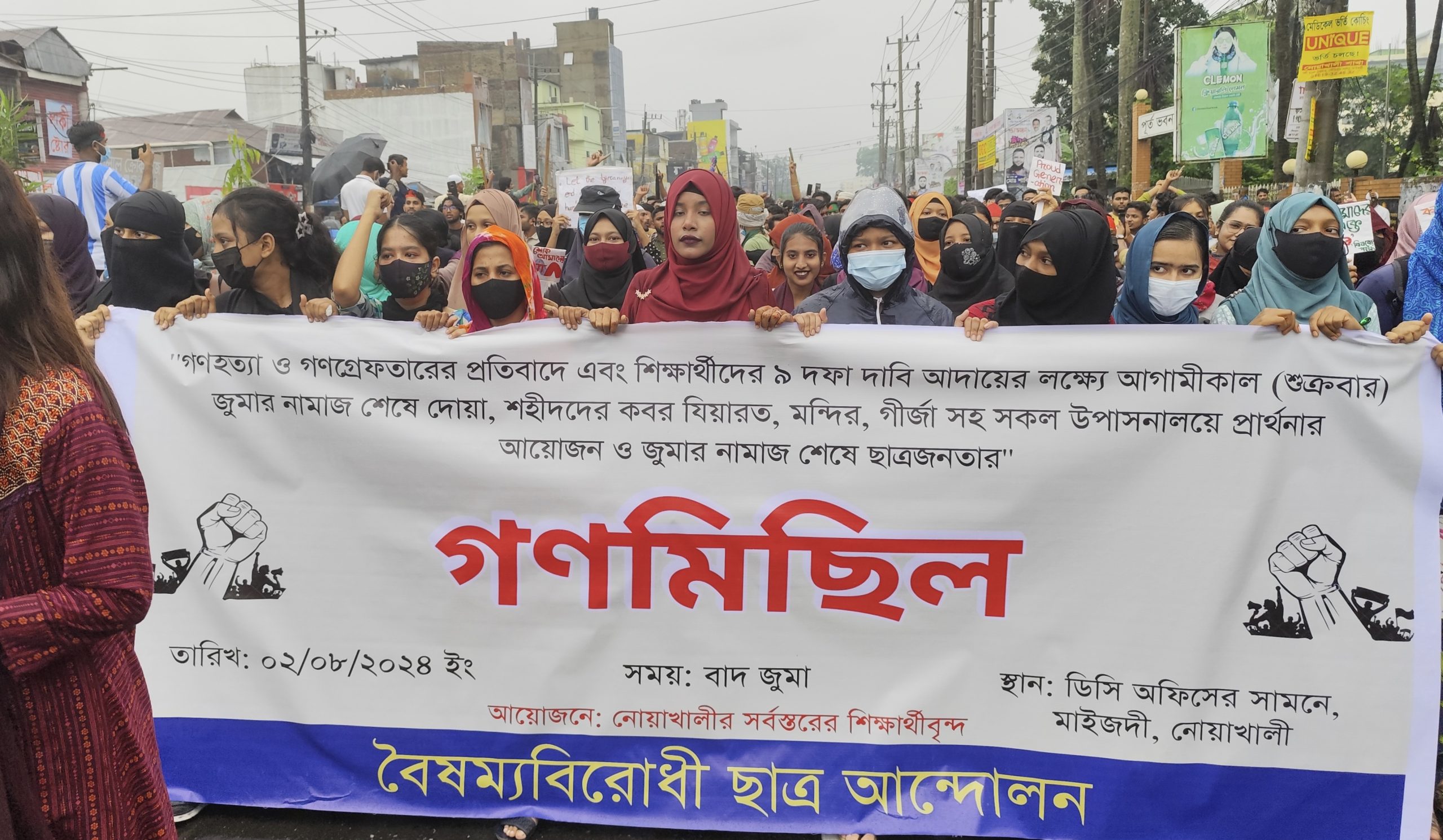 শুক্রবার (২ আগস্ট) দুপুর আড়াইটার দিকে বৃষ্টি উপেক্ষা করে জেলা শহর মাইজদীর পুরাতন বাসস্ট্যান্ড থেকে ছাত্র জনতার সমন্বয়ে বিক্ষোভ মিছিলটি প্রধান সড়ক প্রদক্ষিণ করে জিলা স্কুলের সামনের প্রধান সড়কে এসে অবস্থান নিয়ে প্রতিবাদ সমাবেশ করে।