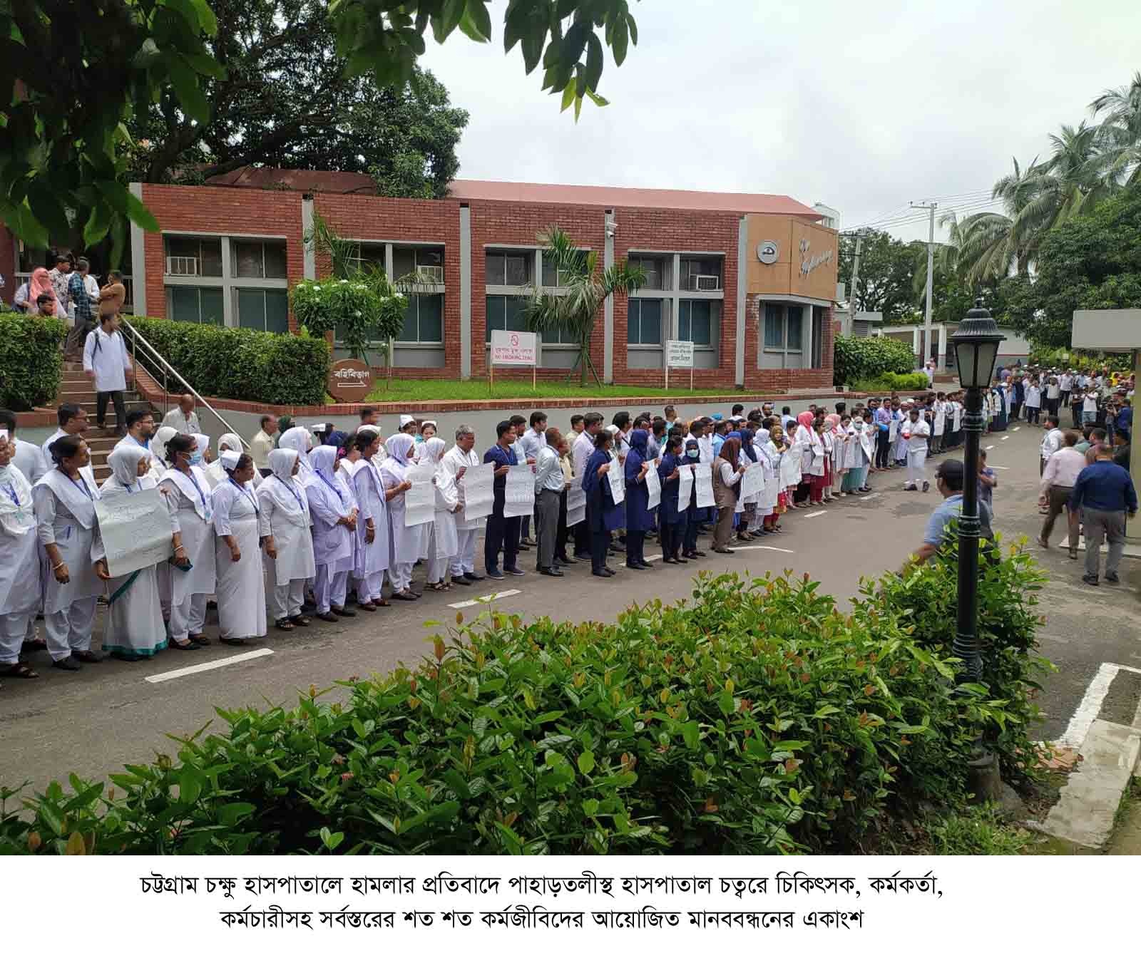 সেবামূলক প্রতিষ্ঠান চট্টগ্রাম চক্ষু হাসপাতালে হামলার প্রতিবাদে বৃহস্পতিবার পাহাড়তলীস্থ হাসপাতাল চত্বরে মানববন্ধন অনুষ্ঠিত হয়। বেলা ১২টায় আয়োজিত মানববন্ধনে চট্টগ্রাম চক্ষু হাসপাতাল ও প্রশিক্ষণ কেন্দ্রে হামলা ও উক্ত প্রতিষ্ঠানের ম্যানেজিং ট্রাস্টি, আন্তর্জাতিক চক্ষু বিশেষজ্ঞ অধ্যাপক ডা. রবিউল হোসেনের উপর হামলার তীব্র প্রতিবাদ ও নিন্দা জানানো হয়। মানববন্ধনে বলা হয়, মো.এম. এ. মালেক এর পুত্র মো. ওয়াহিদ মালেকের নেতৃত্বে ৩৫/৪০ জনের হামলাকারী হাসপাতাল ক্যাম্পাসে অধ্যাপক ডা. রবিউল হোসেনের বাসায় প্রবেশ করে হুইল চেয়ার থেকে টেনে তোলে ও শারীরিকভাবে হেনস্থা করে। তারা উনার স্ত্রীর বেড রুমে প্রবেশ করে তাঁর অসুস্থ’ স্ত্রীর গায়ে হাত তোলার পাশাপাশি ২টি মোবাইল সেট, স্বর্ণালংকার ও অন্যান্য মূল্যবান মালামাল লুট করে নিয়ে যায়। এছাড়াও (বাংলাদেশ অন্ধ কল্যাণ সমিতি বিএনএসবি)’র কার্যকরী কমিটির সদস্য রিয়াজ হোসেনের বাসায় হামলা করে তার স্ত্রী ও তার বাসায় মেহমানদের অকথ্য ভাষায় গালিগালাজ, মারধর এবং ছোট শিশুদের গায়েও হাত তোলে। এ সময় তারা রিয়াজ হোসেনকে হত্যার চেষ্টাকালে সে আত্মরক্ষার্থে একটি কক্ষে আত্নগোপন করে। পরবর্তীতে সন্ত্রাসীরা এ পরিবারের ৪টি মোবাইল সেট, ল্যাপটপ, তার স্ত্রীর স্বর্নালংকারসহ মূল্যবান জিনিসপত্র লুট করে নিয়ে যায়। হাসপাতালের চিকিৎসক, কর্মকর্তা, কর্মচারীসহ সর্বস্তরের শত শত কর্মজীবিদের আয়োজিত এই মানববন্ধন থেকে হামলার তীব্র নিন্দার পাশাপাশি হামলাকারীদের দ্রুত গ্রেফতারের দাবি জানান।
