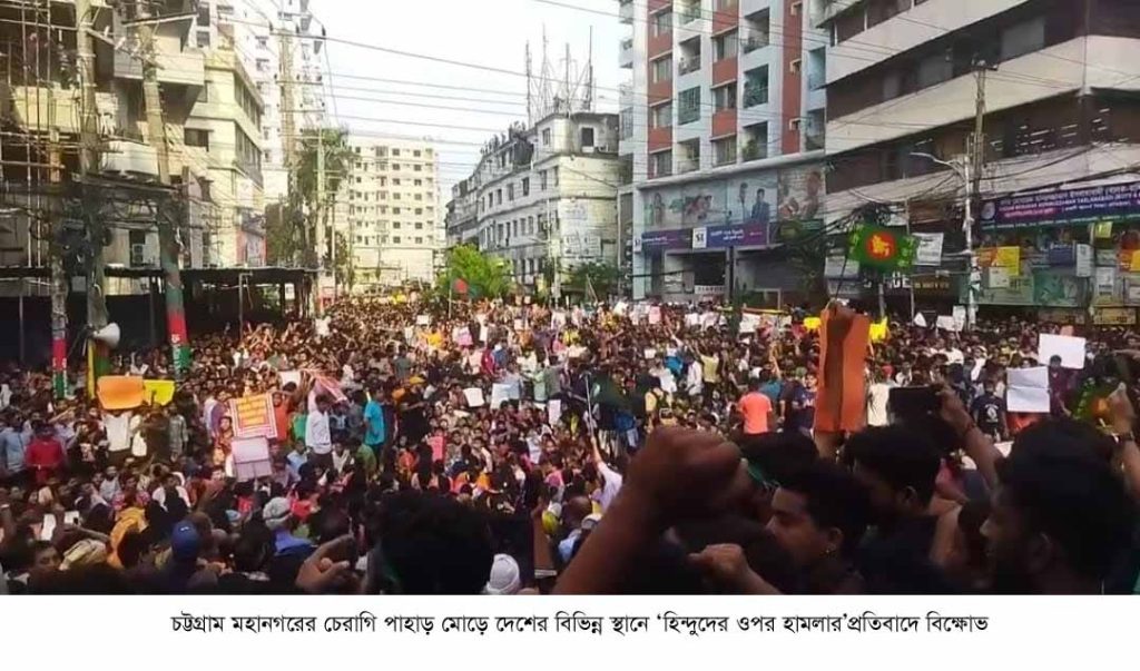 চট্টগ্রাম মহানগরের চেরাগি পাহাড় মোড়ে অবস্থান কর্মসূচি ও বিক্ষোভ করেছেন সনাতন ধর্মাবলম্বীরা। দেশের বিভিন্ন স্থানে ‘হিন্দুদের ওপর হামলার’প্রতিবাদে গতকাল শনিবার বিকেলে সড়ক অবরোধ করে নির্যাতন বন্ধের দাবিতে বিক্ষোভ করেন তারা। দাবি অনুযায়ী দেশে সংখ্যালঘু নির্যাতন বন্ধ না হলে আরও কঠোর কর্মসূচির ঘোষণার হুঁশিয়ারি দেওয়া হয়।