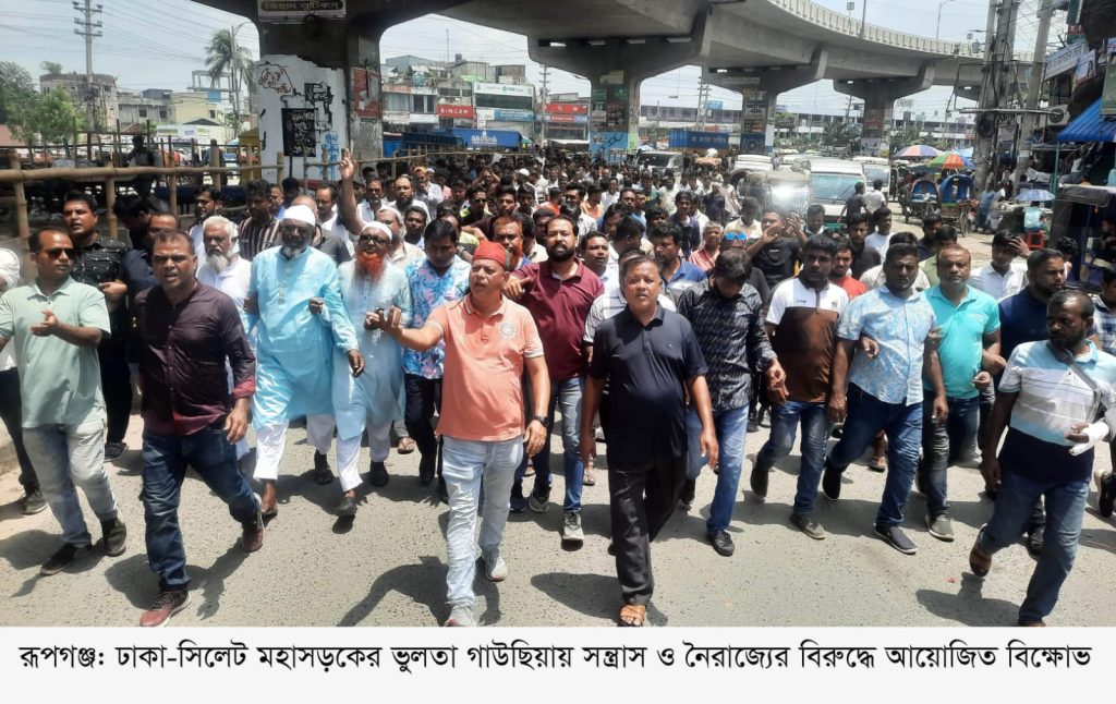 সন্ত্রাস, নৈরাজ্য, সংখ্যালঘুদের উপর হামলা ভাংচুর লুটপাট, চাঁদাবাজি ও মুখোশধারী সন্ত্রাসীদের বিরুদ্ধে রূপগঞ্জ উপজেলা বিএনপির বিক্ষোভ মিছিল ও পথসভা করে। গতকাল১৪ আগষ্ট বুধবার ঢাকা-সিলেট মহাসড়কের রূপগঞ্জের ভুলতা গাউছিয়া এ কর্মসূচি পালন করে। পথসভায় সভাপতিত্ব করেন নারায়ণগঞ্জ জেলা স্বেচ্ছাসেবক দলেরআহ্বায়ক মাহাবুবুর রহমান।