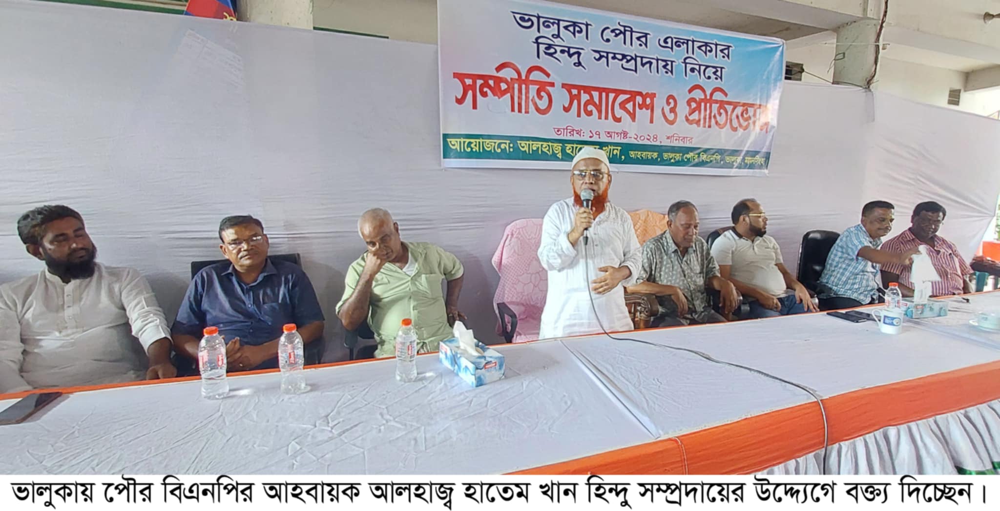ময়মনসিংহের ভালুকায় পৌর বিএনপির আহবায়ক আলহাজ্ব হাতেম খানের উদ্যোগে পৌর এলাকার হিন্দু সম্প্রদায় নিয়ে সম্পীতি সমাবেশ ও প্রীতিভোজ অনুষ্ঠিত হয়েছে। ১৭ আগস্ট শনিবার সকালে ভালুকা পৌর এলাকার ২ নং ওয়ার্ডে অবস্থিত কেন্দ্রীয় হরিসভা মন্দিরে হিন্দু সম্প্রদায়ের সাথে বিএনপি নেতাকর্মীদের আলোচনা সভায় শ্রী অজিত বনিকের সভাপতিত্বে ও শ্রী স্বপন বনিকের সঞ্চালনায় প্রধান অতিথি হিসেবে বক্তব্য রাখেন, ময়মনসিংহ দক্ষিন জেলা বিএনপির সাবেক যুগ্ম আহবায়ক, ময়মনসিংহ দক্ষিন জেলা বিএনপির আহবায়ক কমিটির সদস্য উপজেলা বিএনপির সিনিয়র যুগ্ম আহবায়ক আলহাজ্ব মুহাম্মদ মোর্শেদ আলম। এছাড়াও বক্তব্য রাখেন, পৌর বিএনপির আহবায়ক আলহাজ্ব হাতেম খান, উপজেলা বিএনপির যুগ্ম আহবায়ক রুহুল আমিন, উপজেলা বিএনপির সদস্য আলমগীর হোসেন, পৌর বিএনপির সদস্য আমান উল্লাহ তাজুন, উপজেলা শ্রমিকদলের সভাপতি সৌমিক হাসান সোহাগ, সাধারণ সম্পাদক শাহ মোঃ সুজন, উপজেলা পুজা উদযাপন কমিটির সভাপতি শ্রী মলয় নন্দী মানিক, হিন্দু বোদ্ধ খ্রিষ্টান ঐক্য পরিষদের যুগ্ম সাধারন সম্পাদক বাবু গেনেন্দ্র দাস, হিন্দু বোদ্ধ খ্রিষ্টান ঐক্য পরিষদের নেতা রতি রঞ্জন বর্মন প্রমূখ৷ এছাড়াও বিএনপি ও সহযোগী সংগঠনের বিভিন্ন পর্যায়ের নেতৃবৃন্দ সহ হিন্দু সম্প্রদায়ের নেতৃবৃন্দ উপস্থিত ছিলেন।