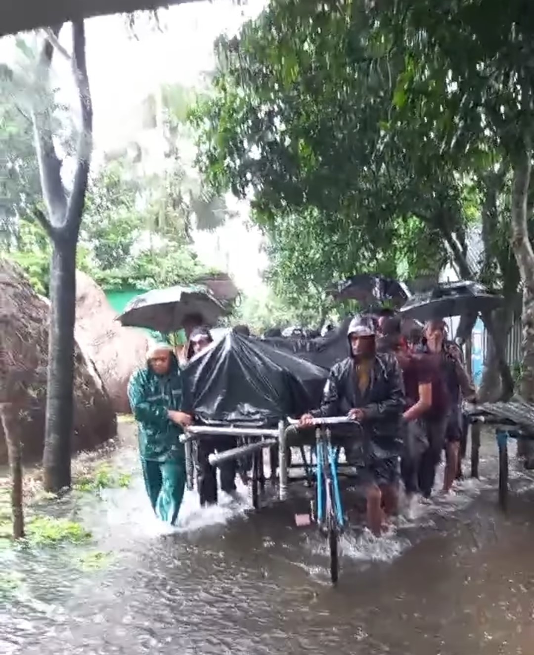 নোয়াখালীতে বন্যায় বিস্তৃত পানির কারণে ভ্যান গাড়ি করে আরজু (৪০) নামে এক যুবকের মরদেহ দাফন করা হয়েছে প্রতিবেশীর কবরস্থানে।