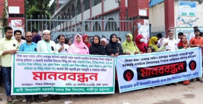 ঢাকা শিক্ষাভবনে সেসিপ প্রকল্পের কর্মকর্তা ও কর্মচারী কর্তৃক সরকারি মাধ্যমিক বিদ্যালয়ের শিক্ষক লাঞ্ছিত করার প্রতিবাদে ও সরকারি মাধ্যমিক বিভাগের বিভিন্ন শুন্য পদে দ্রুত পদোন্নতি/পদায়নের দাবিতে রাণী বিলাসমণি সরকারি বালক উচ্চ বিদ্যালয়ের শিক্ষকবৃন্দরা এই মানববন্ধন করেছে। ১৮ সেপ্টেম্বর বুধবার দুপুরে গাজীপুর জেলা প্রশাসক কার্যালয়ের সামনে রাজবাড়ী রোডে এই মানববন্ধন অনুষ্ঠিত হয়। উক্ত মানববন্ধনে সিনিয়র শিক্ষক সাইয়েদ আমিনুল এহসানের সভাপতিত্বে ও সিনিয়র শিক্ষক মোহাম্মদ মোখলেছুর রহমান চৌধুরী টুটুলের সঞ্চালনায় বক্তব্য রাখেন, আবু জাফর মুহাম্মদ ছালেহ, আসাদুজ্জামান, আব্দুল মতিন মিয়া, নাছরিন আঞ্জুমান রুনী, রায়হান উদ্দিন, জসিম উদ্দিন ও মোঃ রুবেল মিয়া প্রমুখ। মানববন্ধনে বক্তারা ঢাকা শিক্ষাভবনে শিক্ষকের উপর হামলাকারীর শাস্তি দাবি করেন যাতে অনুরুপ ঘটনা পুনরাবৃত্তি না ঘটে। পাশাপাশি মাধ্যমিক ও উচ্চ শিক্ষা অধিদপ্তরের অধীন সরকারি মাধ্যমিক বিভাগের বিভিন্ন শুন্যপদে সহকারি শিক্ষক, সিনিয়র শিক্ষক, উপজেলা মাধ্যমিক শিক্ষা অফিসার, সহকারী প্রধান শিক্ষক, সহকারী জেলা শিক্ষা অফিসার, প্রধান শিক্ষক, জেলা শিক্ষা অফিসার সহ বিভিন্ন সমমান পদে দ্রুত পদোন্নতি/পদায়নের দাবি জানান। মানববন্ধনে রাণী বিলাসমণি সরকারি বালক উচ্চ বিদ্যালয়ের প্রধান শিক্ষক মোঃ আক্তার হোসেন মিয়া একাত্মতা প্রকাশ করেন।