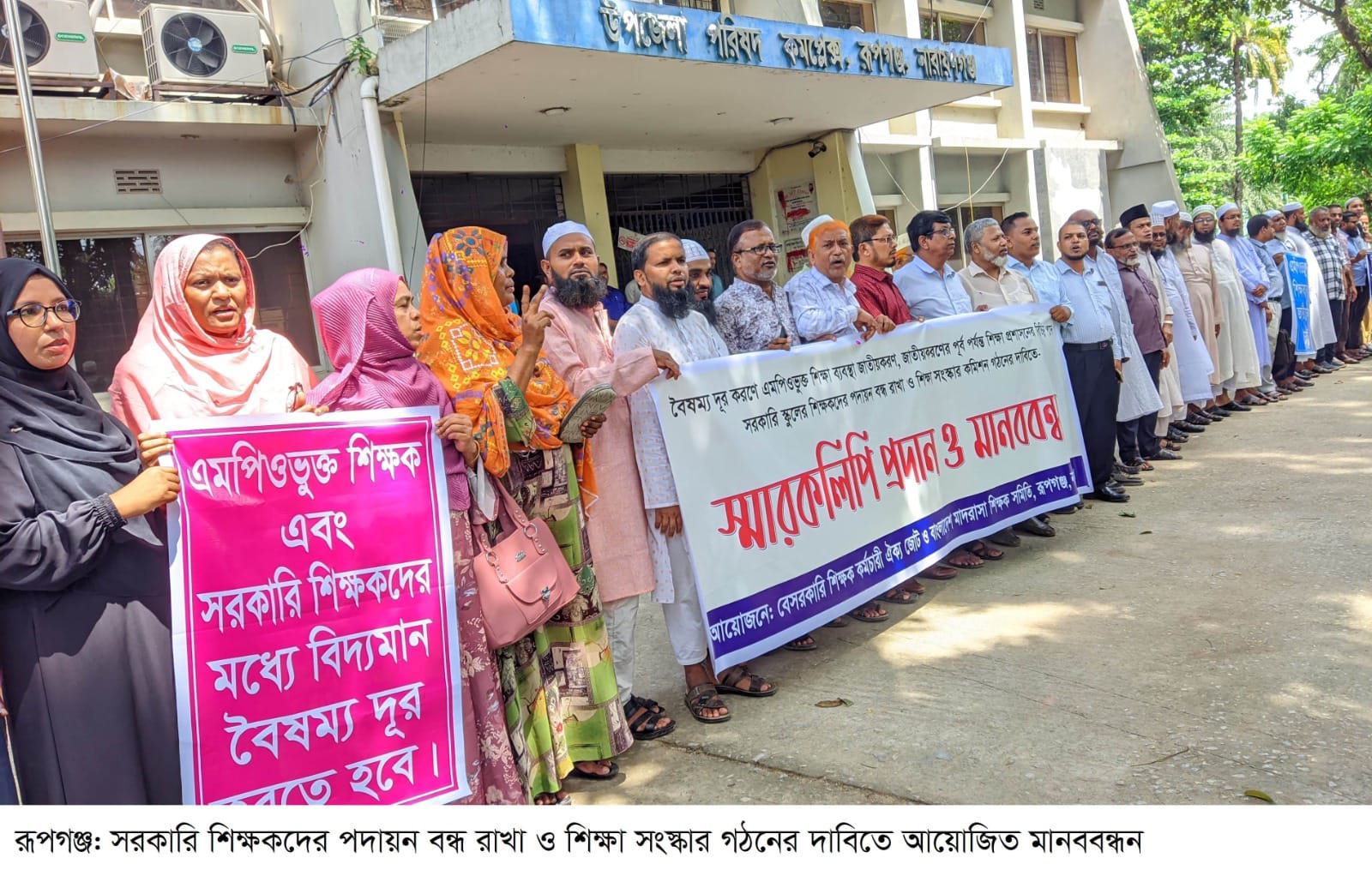 সারা দেশের ন্যায় নারায়ণগঞ্জের রূপগঞ্জে বৈষম্য দূর করণে এমপিওভুক্ত শিক্ষা ব্যবস্থা জাতীয়করণ, জাতীয়করণের পূর্ব পর্যন্ত শিক্ষা প্রশাসনের বিভিন্ন পদে সরকারি স্কুলের শিক্ষকদের পদায়ন বন্ধ রাখা, শিক্ষা সংস্কার কমিশন গঠনের দাবিতে স্মারক লিপি প্রদান ও মানববন্ধন কর্মসূচি পালন করছে শিক্ষকরা। গতকাল ২৪ সেপ্টেম্বর মঙ্গলবার উপজেলা পরিষদ কমপ্লেক্সের সামনে এ মানববন্ধন কর্মসূচি পালন করে তারা। মানববন্ধন পূর্বক আয়োজিত সভায় সভাপতিত্ব করেন সলিম উদ্দিন চৌধুরী ডিগ্রি কলেজের অধ্যক্ষ জাহাঙ্গীর মালুম।