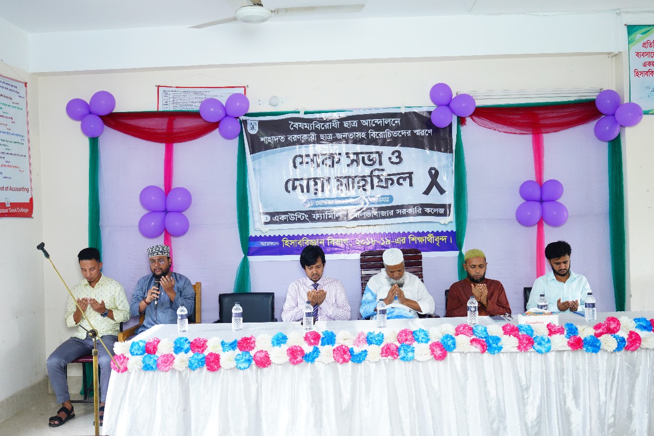 মৌলভীবাজার সরকারি কলেজে একাউন্টিং ফ্যামিলির উদ্যোগে বৈষম্য বিরোধী ছাত্র আন্দোলনে শহীদদের প্রতি শোক ও দোয়া মাহফিল অনুষ্ঠিত হয়েছে।মৌলভীবাজার সরকারি কলেজের হিসাববিজ্ঞান বিভাগের হল রুমে, আন্দোলনে শাহাদাত বরণকারী ছাত্র-জনতা সহ বিরোচিতদের স্মরণে এই শোক সভা ও দোয়া মাহফিল। এবং হিসাব বিজ্ঞান বিভাগের ১৮-১৯ সেশনের শিক্ষার্থীদের বিদায় অনুষ্ঠান আয়োজন করা হয়।