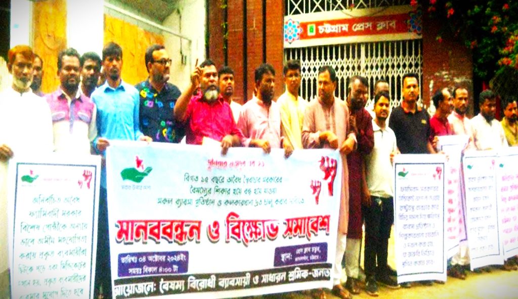 বিগত ১৫ বছরে স্বৈরাচারী সরকারের অপশাসনে ক্ষতিগ্রস্থ ও বন্ধ হয়ে যাওয়া শিল্প ও কারখানা দ্রুত চালু করে কর্মসংস্থান সৃষ্টি করার দাবিতে মানববন্ধন ও বিক্ষোভ সমাবেশ অনুষ্ঠিত হয়েছে চট্টগ্রামে। আজ বিকেলে জামাল খান চট্টগ্রাম প্রেসক্লাব চত্বরে এ মানব বন্ধন ও বিক্ষোভ সমাবেশ অনুষ্ঠিত হয়। এ সময় সাধারণ ব্যবসায়ী ও শ্রমিকরা তাদের নয় দফা দাবি তুলে ধরেন। বলেন, বিগত ১৫ বৎসর ভিন্ন মতাদর্শের কারনে ফ্যাসিবাদ সরকারের অন্যায় অত্যাচার ও নির্যাতনে প্রায় বন্ধ অবস্থায় ছিল দেশের অনেক শিল্প মালিক। দরবেশ বাবা খ্যাত সালমান এফ রহমান এবং ব্যাংক খেকো এস আলম সিন্ডিকেট এর ইশারা ছাড়া কেউ কোন ধরনের লোন সুবিধা পায়নি। তাদের অত্যাচারে বন্ধ হয়ে গেছে দেশের হাজারও শিল্প কল কারখানা ও ব্যবসআ প্রতিষ্ঠান। বিশেষ করে এস আলম গ্রুপ ও তাদের দোসরদের কারনে চট্টগ্রামের প্রায় ৬ শতাধিক শিল্প কল কারকানা বন্ধ করে দেয়া হয়েছে। হাজার হাজার শ্রমিক তাদের কর্মসংস্থান হারিয়েছে। এসব শিল্প কল কারখানার শ্রমিকেরা এখন পরিবারবর্গ নিয়ে মানবেতর দিন যাপন করতেছে। তাই আপনার মাধ্যমে সরকারের কাছে বন্ধ কারখানা দ্রুত চালু করে হাজার হাজার পরিবারের জীবন বাঁচানোর জন্য ৯ দফা দাবী তুলে ধরছি। ১। ইউক্রেন রাশিয়ার যুদ্ধকালীন সময় বৈদেশিক বানিজ্যে ডলার সংকট ও অন্যান্য অসুবিধার কারনে এক বিপর্যয় নেমে আসে। এসময় ব্যংকিং সুবিধা স্বৈরাচার সরকারের গড়া সিন্ডিকেট নিয়ন্ত্রন করে তারা সুবিধা লুটে নেয়। তাদের সিন্ডিকেটের বাহিরে থাকা ব্যবসায়ী, শিল্পপতিরা ব্যবসায় সমতা রক্ষা করতে ব্যর্থ হয়। ২। কভিড-১৯ এর সময় সময় ব্যবসায়িরা আর একটি বিপর্যয়ের মুখোমুখী হয়। এ সময় ও তথাকথিত অবৈধ সরকারের দোসররা একচেটিয়া এক তরফা ভাবে ব্যাবসা নিজেদের নিয়ন্ত্রনে রাখে এবং ব্যাংকিং লোন নেওযার সুবিধা তারাই ভোগ করে। ৩। বিগত ১৫ বছরে অবৈধ স্বৈরাচারী সরকারের বৈষম্যের শিকার হয়ে বন্ধ হয়ে যাওয়া সকল ব্যবসা প্রতিষ্ঠান শল্প কল কারখানা দ্রুত চালু করার জন্য দ্রুত ব্যবস্থা গ্রহন করে কর্মসংস্থানের ব্যবস্থা করতে হবে। ৪। ফ্যাসিবাদ সরকারের সিন্ডিকেটের লুটপাটে অংশ না নেওয়ায়, রাষ্ট্রযন্ত্র ব্যবহার করে বিভিন্ন হয়রানী মূলক মিলা দিয়ে খতিগ্রস্থ করা ব্যবসা প্রতিষ্ঠান দখল মুক্ত করতে হবে। পাশাপাশি অন্যায় ভাবে করা মামলা বাতিল রতে হবে। ৫। খতিগ্রস্থ সকল ব্যবসা প্রতিষ্ঠান ও কারখানা পূর্নবাসনের লক্ষ্যে নতুন আর্থিক নীতি মালা গ্রহন করতে হবে। ৬। ব্যবসা প্রতিষ্ঠান ও শিল্প কারখানার সাথে জড়িত সকল কর্মকর্তা/কর্মচারীদের চাকুরী নিশ্চিত করে সকল সুযোগ সুবিধা ও নিরাপত্তা দিতে হবে। ৭। অবৈধ ফ্যাসিবাদী সরকার বিশেষ ব্যবসায়ী ও গোষ্ঠীকে অন্