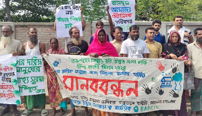 বিশ্ব বসতি দিবস ২০২৪ উপলক্ষ্যে রাজশাহী নগরীর নামোভদ্রা বস্তির লেকপাড়ে নিরাপদ বসতির দাবিতে মানববন্ধন অনুষ্ঠিত হয়। এতে রাজশাহীর বিভিন্ন বস্তি থেকে আগত নারী পুরুষগণ অংশগ্রহণ করেন। নগর দরিদ্র মানুষের অধিকার বাস্তবায়ন কমিটির আয়োজনে উক্ত মানবন্ধনটি সঞ্চালনা করেন বারসিক’র গবেষক ও আঞ্চলিক সমন্বয়কারী মো: শহিদুল ইসলাম। এতে বক্তব্য দেন নগর দরিদ্র মানুষের অধিকার বাস্তবায়ন কমিটির আহবায়ক খোরসেদ আলম, সদস্য সচিব নিলুফা ইসমত আরা, বরেন্দ্র ইয়ুথ ফোরাম এর সভাপতি শাইখ তাসনীম জামালসহ প্রমুখ ব্যক্তিবর্গ।