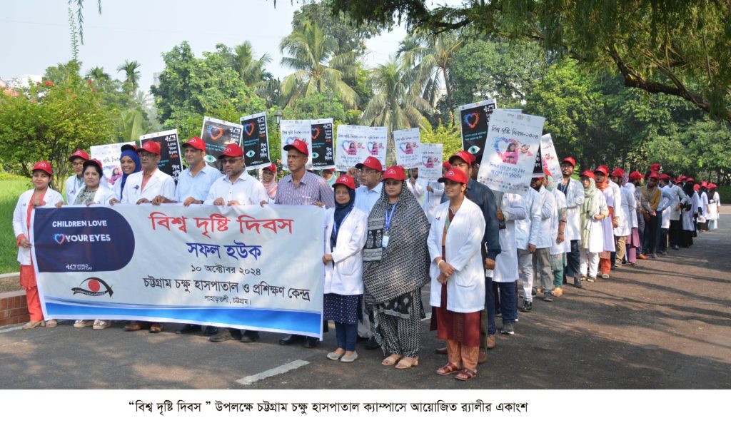 চট্টগ্রাম চক্ষু হাসপাতাল ও প্রশিক্ষণ কেন্দ্রে (সিইআইটিসি) ‘বিশ্ব দৃষ্টি দিবস-২০২৪’ উদ্যাপিত হয়েছে। অন্ধত্ব প্রতিরোধ এবং চোখের সমস্যা সম্পর্কে সাধারণের মধ্যে সচেতনতা ছড়িয়ে দিতে ২০০০ সাল থেকে প্রতিবছর অক্টোবরে বিশ্বব্যাপী দিবসটি পালিত হয়ে আসছে। এ উপলক্ষে সোমবার সকাল সাড়ে আটটায় সিইআইটিসি চত্ত্বরে র‌্যালী অনুষ্ঠিত হয়। র‌্যালীর উদ্বোধন করেন চট্টগ্রাম চক্ষু হাসপাতালের মেডিকেল ডিরেক্টর ডা. রাজীব হোসেন। উপস্থিত ছিলেন, আইসিও এর পরিচালক অধ্যাপক ডা. খুরশীদ আলম, অধ্যাপক ডা. মোহাম্মদ মুনিরুজ্জামান ওসমানী,সিনিয়র কনসালটেন্ট ডা. নাসিমুল গনি চৌধুরী, সিনিয়র কনসালটেন্ট ডা. সুজিত কুমার বিশ্বাস, কনসালটেন্ট ডা. তাহমিনা আক্তার, ডা. মোহাম্মদ আমিনুর রহমান, ডা. সালমা আকবর, ডা. আনিকা রহমান, ডা. তানজিলা আহমেদ রিয়া, ডা. নাহিদ আনজুম, ডা. তারিন, ডা. মৌসুমী চৌধুরী, ডা. শেলী বিশ্বাসসহ হাসপাতালের চিকিৎসক, অপটোমেট্রি, প্যারামেডিক ও শিক্ষার্থীবৃন্দ।