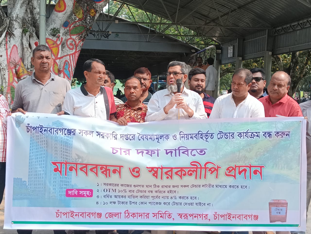 দাবি ৪টি হচ্ছে- ১. সরকারের কাজের গুণগত মান ঠিক রাখার জন্য সকল টেন্ডার লটারির মাধ্যমে করতে হবে; ২. ওটিএম ১০ শতাংশ বার টেন্ডার বন্ধ করতে হবে; ৩. বর্ধিত আয়কর বাতিল করে পূর্বের ন্যায় ৪ শতাংশ করতে হবে এবং ৪. ১০ লাখ টাকার উপর কোনো প্যাকেজ করে টেন্ডার দেওয়া যাবে না।
