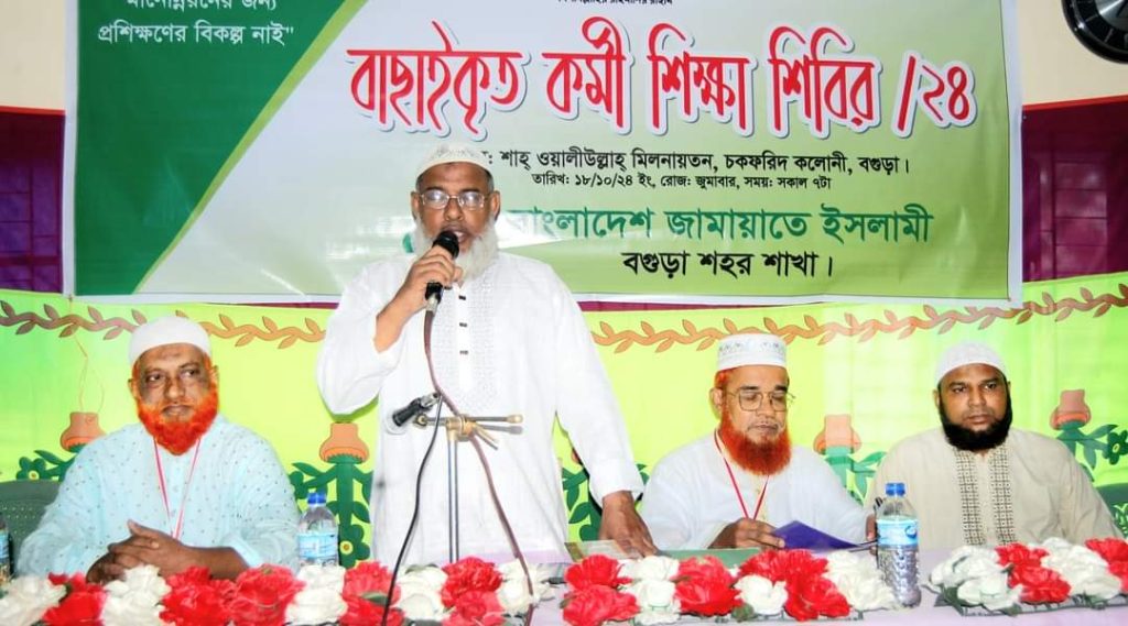 বগুড়ার কলোনীস্থ শাহওয়ালী উল্লাহ মিলনায়তনে বাংলাদেশ জামায়াতে ইসলামী বগুড়া শহর শাখার আয়োজিত বাছাইকৃত কর্মী শিক্ষা শিবির শহর আমীর অধ্যক্ষ আবিদুর রহমান সোহেলের সভাপতিত্বে অনুষ্ঠিত হয়। শহর জামায়াতের তারবিয়াত সেক্রেটারী অধ্যাপক আব্দুর রাজ্জাকের পরিচালনায় অনুষ্ঠানে প্রধান অতিথির বক্তব্য রাখেন কেন্দ্রীয় মজলিশে সুরা সদস্য ও বগুড়া অঞ্চলের টিম সদস্য অধ্যাপক নজরুল ইসলাম, কেন্দ্রীয় মজলিশে সুরা সদস্য ও বগুড়া অঞ্চলের টিম সদস্য মাও: আব্দুর রহীম, জয়পুরহাট জেলা জামায়াতের আমীর ডা. ফজলুর রহমান সাঈদ, শহর জামায়াতের নায়েবে আমীর মাও: আব্দুল হালিম বেগ, সেক্রেটারী আ স ম আব্দুল মালেক, সহকারী সেক্রেটারী রফিকুল আলম, তালিমুল কুরআন ফাউন্ডেশনের কেন্দ্রীয় প্যানেল ওস্তাদ ক্বারী মাও: আব্দুল্লাহ আল মামুন। অনুষ্ঠানে প্রধান অতিথি বলেন কর্মীদের আরো বেশী কুরআন হাদিস অধ্যায়ন করে শপথের কর্মী হয়ে গড়ে উঠার আহবান জানান।