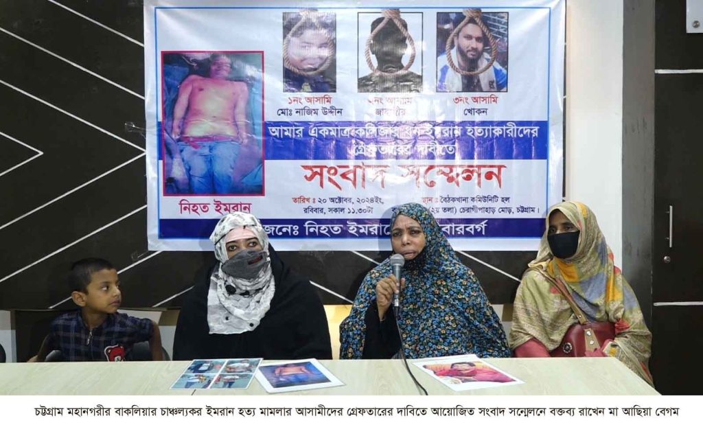 আছিয়া বেগম আরো বলেন, বাকলিয়ার এল ব্লকের খালপাড় রসুল বাগের একটি বাসাতে আমার এক ছেলে ও এক মেয়ে নিয়ে সুখের সংসার ছিল। সে সুখ কেড়ে নিয়েছে চিহ্নিত তিনজন হত্যাকারী। ছেলে হত্যর এতদিন পেরিয়ে গেলেও হত্যাকারী মূল আসামী াকারী মো. নাজিম উদ্দিন, জাহাঙ্গীর, খোকন দুপুরের মো. নাজিম উদ্দিন, জাহাঙ্গীর ও খোকন এলাকায় প্রকাশ্য ঘুরাফেরা করলেও পুলিশ গ্রেফতার করছেনা। বরং আসামীদের হুমকি ধমকিতে প্রতিনিয়ত আতংকে দিন যাপন করতেছি। আমি আমার ছেলে হত্যার আসামিদের দ্রুত গ্রেফতার ও বিচার চাই। সংবাদ সন্মেলনে নিহত ইমরানের বোন জেসমিন আক্তারসহ অন্যান্যরা উপস্থিত ছিলেন।