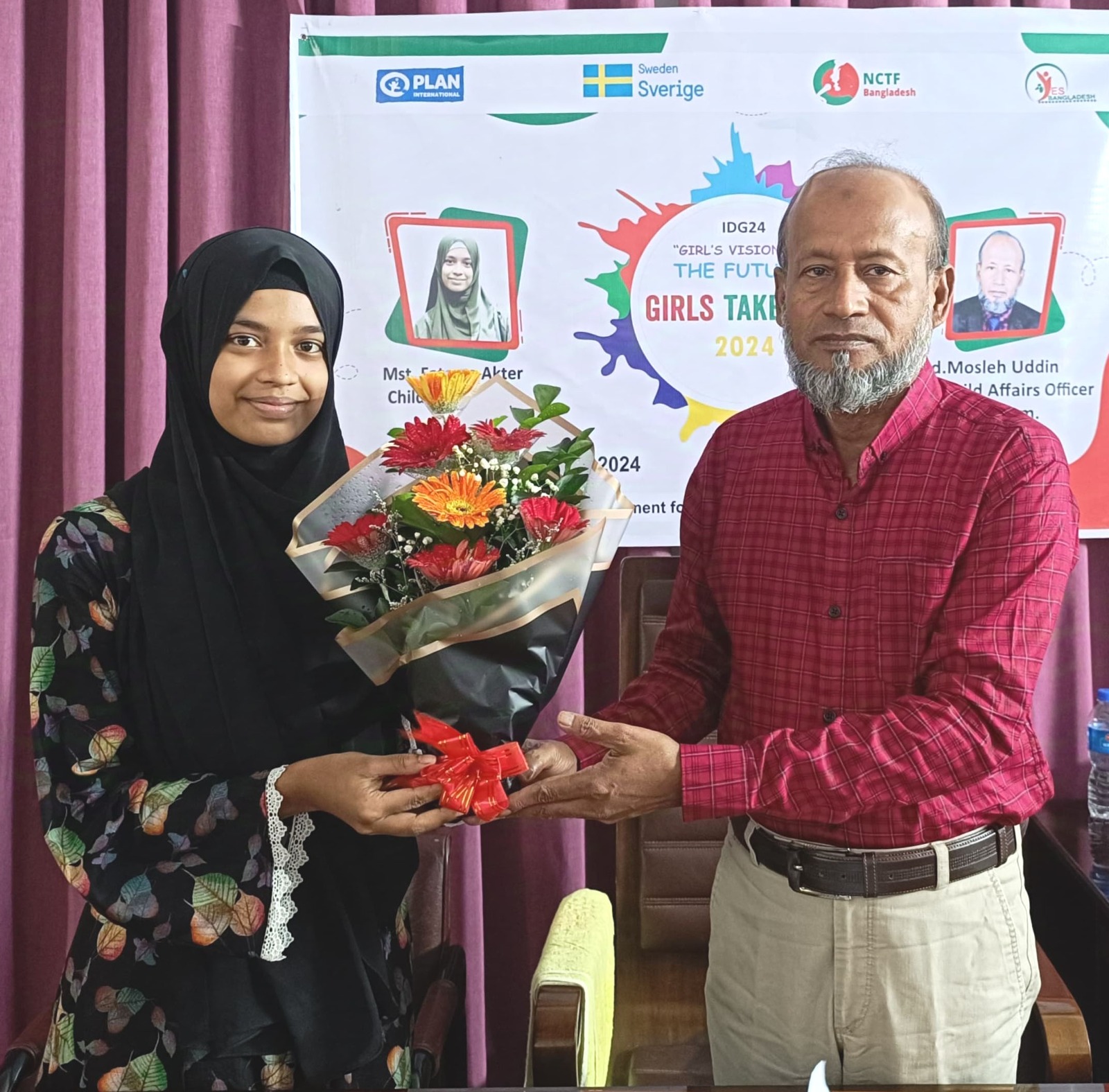এক ঘন্টার জন্য চট্টগ্রাম জেলা শিশু বিষয়ক কর্মকর্তার প্রতীকী দায়িত্ব পালনকারী ন্যাশনাল চিলড্রেন্স টাস্কফোর্স-এর শিশু গবেষক ফাতেমা আক্তারকে ফুল দিয়ে শুভেচ্ছা জানান জেলা শিশু একাডেমির শিশু বিষয়ক কর্মকর্তা মোছলেহ উদ্দীন