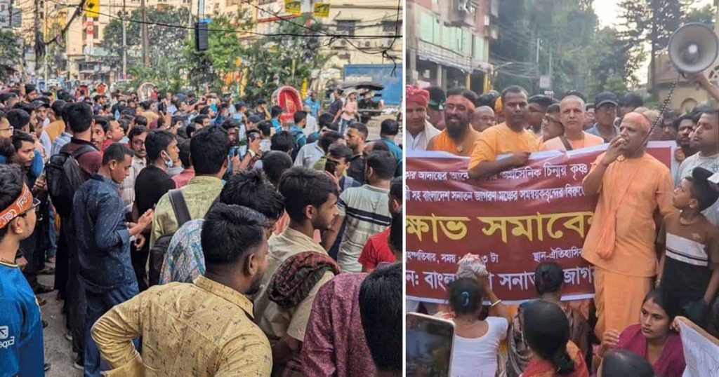 এদিকে চট্টগ্রাম নগরের নিউমার্কেট মোড়ে স্বাধীনতা স্তম্ভে গেরুয়া পতাকা লাগানোর অভিযোগে দুজনকে গ্রেফতার এবং হিন্দুনেতাদের বিরুদ্ধে মামলার প্রতিবাদে চেরাগী পাহাড় মোড়ে বিক্ষোভ সমাবেশ ডেকেছে হিন্দু জাগরণ মঞ্চ। বৃহস্পতিবার সাড়ে সাড়ে ৩টা পর্যন্ত সমাবেশ ঘিরে মূল সড়ক-অলিগলিতে জড়ো হন সবাই। বেলা ৩টা ৪০ মিনিটের কিছু সময় পর বিক্ষোভ শুরু করে সংগঠনটি। এদিকে সমাবেশ ঘিরে চেরাগী পাহাড় মোড়ে সতর্ক অবস্থানে রয়েছেন সেনাবাহিনী পুলিশসহ আইনশৃঙ্খলা বাহিনীর সদস্যরা।