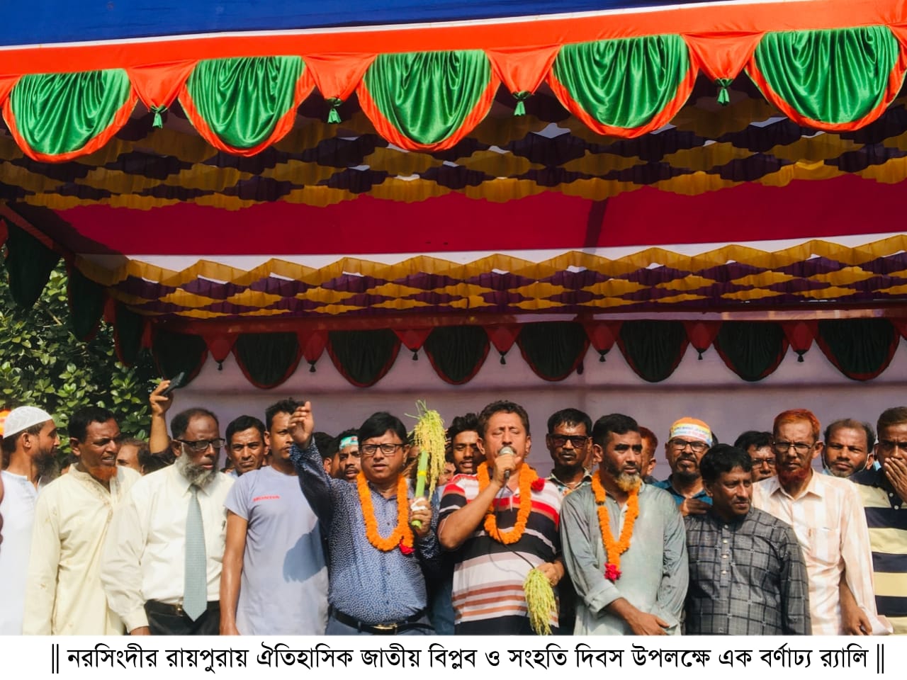 রায়পুরায় ঐতিহাসিক জাতীয় বিপ্লব ও সংহতি দিবস উপলক্ষে বিএনপি কেন্দ্রীয় কমিটির বিজ্ঞান প্রযুক্তি বিষয়ক সহসম্পাদক ইঞ্জিনিয়ার আশরাফ উদ্দিন বকুল এর নেতৃত্বে এক বর্ণাঢ্য র্যালি করেছে রায়পুরা উপজেলা বিএনপি ও দলটির অন্যান্য সংগঠনের নেতৃবৃন্দ।