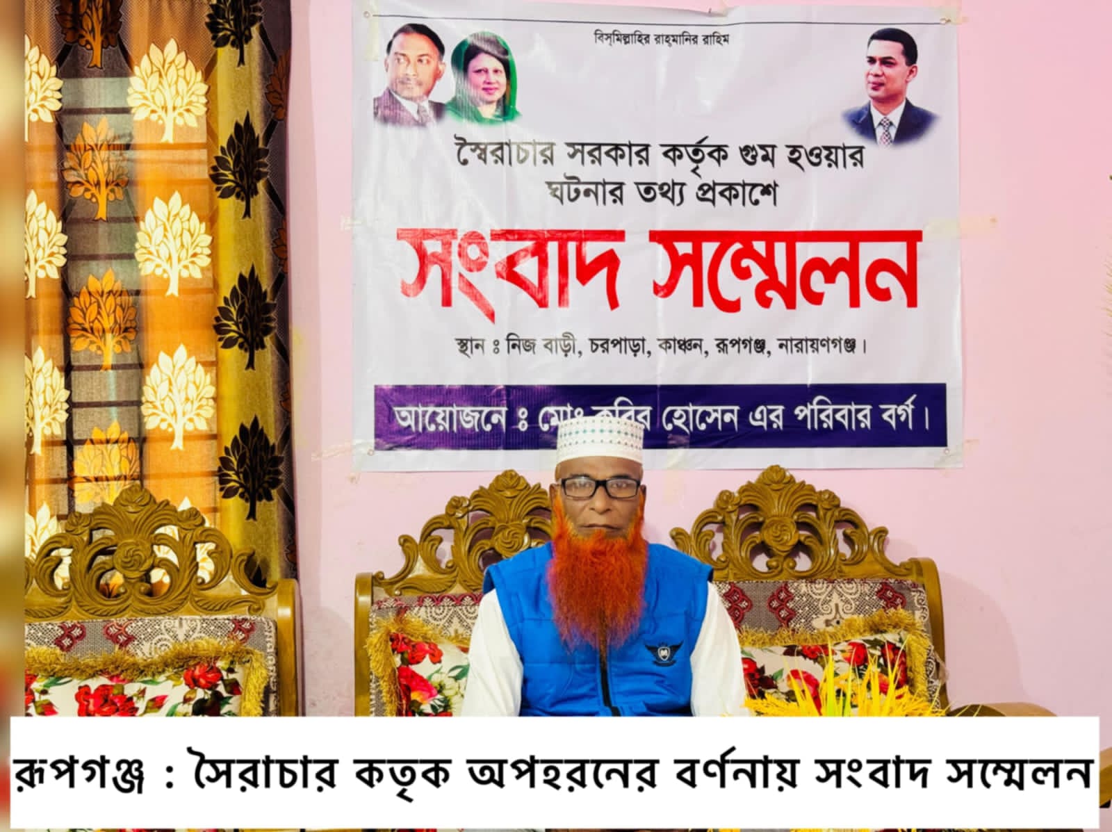 স্বৈরাচার সরকার কর্তৃক গুম হওয়ার ঘটনার পরিস্থিতিতে অবস্থান তুলে ধরতে জরুরি সংবাদ সম্মেলন করেন, কাঞ্চন পৌর বিএনপির যুগ্ম সাধারণ সম্পাদক, মোঃ কবির হোসেন। সোমবার বেলা ১১:৩০ টায় নিজ বাড়ী, রূপগঞ্জ থানাধীন চরপাড়া, কাঞ্চন এ সংবাদ সম্মেলন অনুষ্ঠিত হবে।