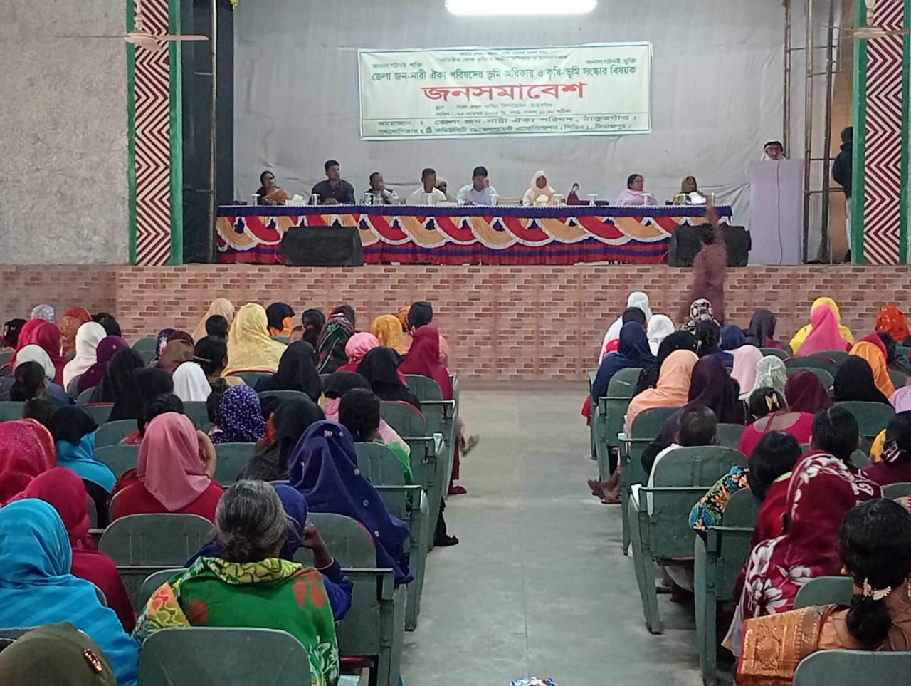 প্রতিষ্ঠিত হোক ভূমিতে নারীর অধিকার ও মানবাধিকার” এ প্রতিপাদ্যকে সামনে রেখে ঠাকুরগাঁওয়ে জেলা জন-নারী ঐক্য পরিষদের ভূমি অধিকার ও কৃষি ভূমি সংষ্কার বিষয়ক জনসমাবেশ অনুষ্ঠিত হয়েছে। জেলা জন-নারী ঐক্য পরিষদের আয়োজনে এবং কমিউনিটি ডেভেলপমেন্ট এসোসিয়েশন (সিডিএ) দিনাজপুরের সহযোগীতায় সোমবার দুপুরে পৌর শহরের মির্জা রুহুল আমিন মিলনায়তনে এ সমাবেশটি অনুষ্ঠিত হয়।
