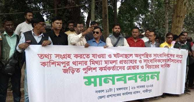 গাজীপুর মহানগরের কাশিমপুর থানার সুরাবাড়ি গ্রামে জমি-সংক্রান্ত বিরোধের তথ্য সংগ্রহ করতে যাওয়া ও ঘটনাস্থলে অনুপস্থিত সাংবাদিকদের নামে কাশিমপুর থানার মিথ্যা মামলা প্রত্যাহার ও সাংবাদিকদের ফাঁসানোয় জড়িত পুলিশ কর্মকর্তাদের গ্রেপ্তার ও বিচারের দাবিতে মঙ্গলবার (২৬ নভেম্বর ২০২৪) সকাল ১১টায় গাজীপুর জেলা প্রশাসকের কার্যালয় প্রাঙ্গনে গাজীপুরে কর্মরত সাংবাদিকেরা মানববন্ধন ও গাজীপুরের জেলা প্রশাসক বরাবরে স্মারকলিপি প্রদান করেছেন।