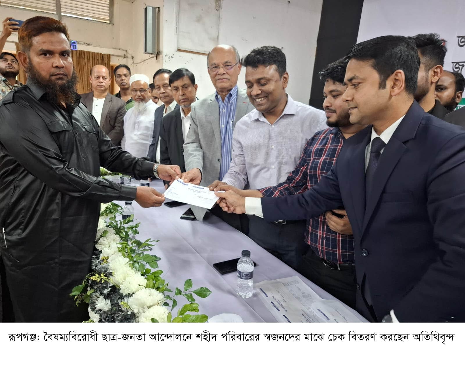 নারায়ণগঞ্জের রূপগঞ্জ উপজেলা প্রশাসনের উদ্যোগে বৈষম্যবিরোধী ছাত্র আন্দোলনে নিহতদের স্মরণে স্মরণসভা ও চেক বিতরণ করা হয়েছে। গতকাল ২৮নভেম্বর বৃহস্পতিবার উপজেলা পরিষদ মিলনায়তনে আয়োজিত এ স্মরণসভায় সভাপতিত্ব করেন রূপগঞ্জ উপজেলা নির্বাহী কর্মকর্তা মোঃ সাইফুল ইসলাম।