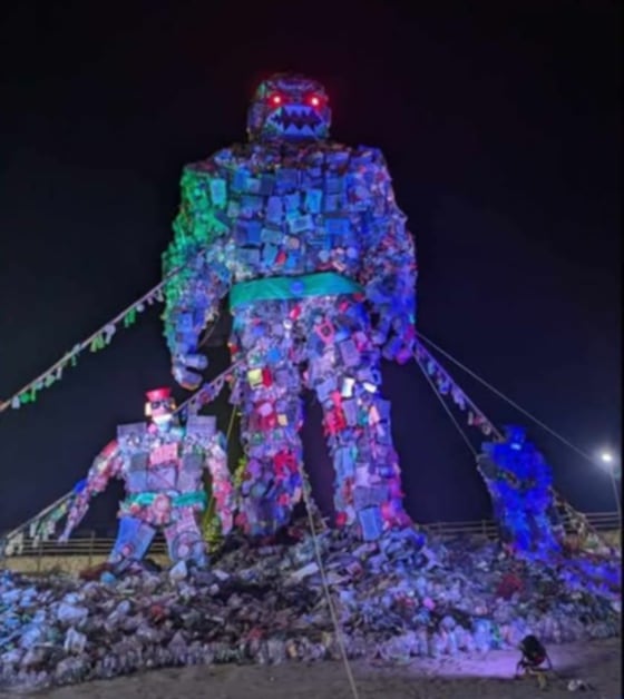 বিদ্যানন্দ ফাউন্ডেশনের দায়িত্বরত স্বেচ্ছাসেবক মুহাম্মদ মুবারক জানান, গত প্রায় ১মাস ধরে কক্সবাজার,ইনানী ও টেকনাফের সমুদ্র সৈকত থেকে সংগ্রহ করেছে অন্তত ১০ মেট্রক টন সামুদ্রিক প্লাস্টিক বর্জ্য। এসব বর্জ্য দিয়ে কক্সবাজার সমুদ্র সৈকতে নির্মাণ করেছেন এ ‘প্লাস্টিক দানব।