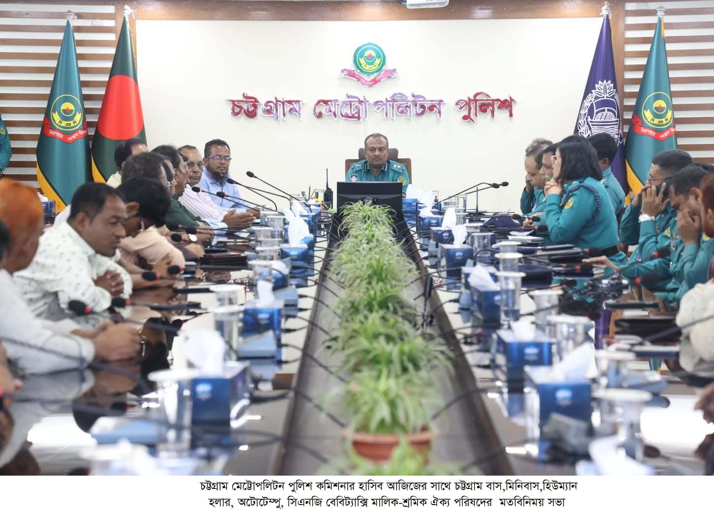 চট্টগ্রাম মেট্টোপলিটন পুলিশ কমিশনার হাসিব আজিজের সাথে চট্টগ্রাম বাস,মিনিবাস,হিউম্যান হলার, অটোটেম্পু, সিএনজি বেবিট্যাক্সি মালিক-শ্রমিক ঐক্য পরিষদের এক মতবিনিময় সভা সকাল ১০টায় অনুষ্ঠিত হয়। সংগঠনের দায়েরকৃত ১১ দফা দাবি নিয়ে উক্ত সভায় সভাপতিত্ব করেন পুলিশ কমিশনার হাসিব আজিজ। শুভেচ্ছা বক্তব্য রাখেন পরিষদের আহবায়ক জাফর আহম্মদ। সদস্য সচিব নজরুল ইসলাম সরকারের পরিচালনায় উপস্থিত ছিলেন অতিরিক্ত পুলিশ কমিশনার (ট্রাফিক) মাসুদ আহমেদ, মো. মোখলেসুর রহমান ডিসি (সিটিএসবি ), অতিরিক্ত ডিআইজি জনাব মো. মাহবুব আলম খান, ডিসি ( ট্রাফিক ) দক্ষিণ জয়নাল আবেদিন, ডিসি (ট্রাফিক) উত্তর অতিরিক্ত ডিআইজি জনাব নিষ্কৃতি চাকমা, ডিসি ( ট্রাফিক )পশ্চিম আগ্রাবাদ মোহাম্মদ সালাম কবির, ডিসি (পরিবহন), অতিরিক্ত ডিআইজিসহ মেট্রোপলিটন পুলিশের অন্যান্য অফিসার গন।