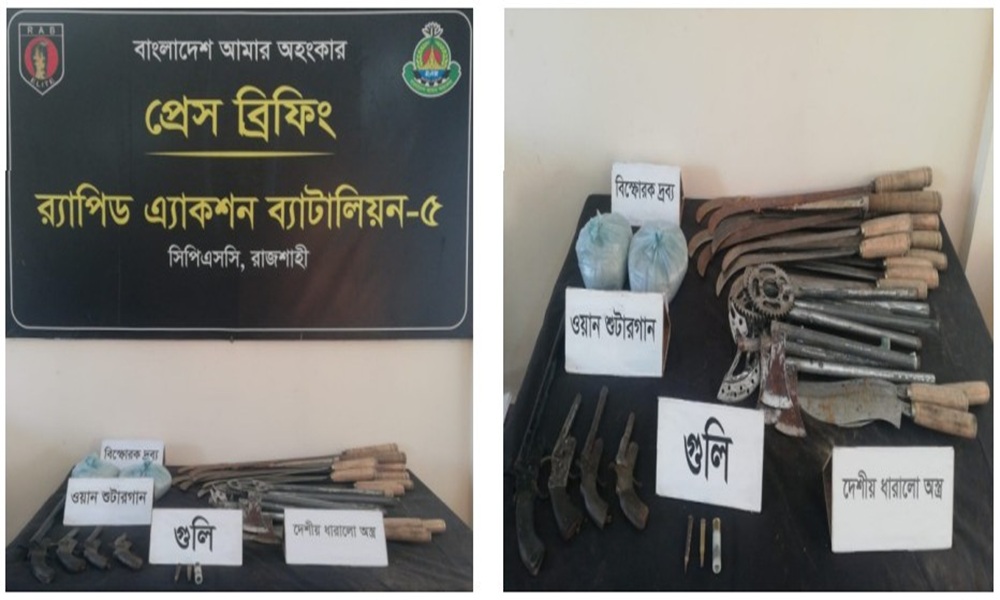 নামক এলাকায় অভিযান পরিচালনা করে বিপুল পরিমাণে ধারালো দেশীয় অস্ত্র, চাইনিজ কুড়াল ১৯ টি, ধারালো