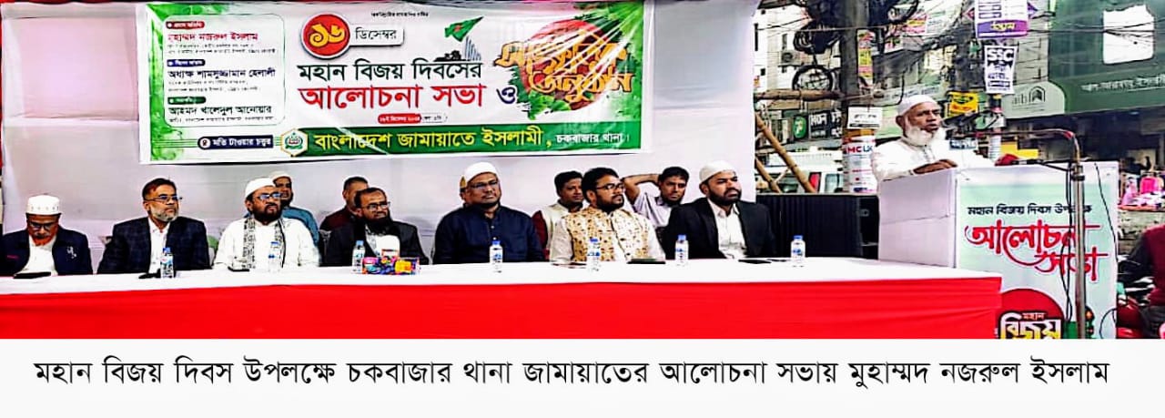 মহান বিজয় দিবস উপলক্ষে পাঁচলাইশ থানা জামায়াতের উদ্যোগে ষোলশহর সুপার মার্কেট চত্বরে আয়োজিত আলোচনা সভায় প্রধান অতিথির বক্তব্যে তিনি এসব কথা বলেন। পাঁচলাইশ থানা জামায়াতের আমীর ইঞ্জিনিয়ার মাহবুবুল হাসান রুমীর সভাপতিত্বে ও সেক্রেটারি মাওলানা মফিজুল হকের সঞ্চালনায় উক্ত আলোচনা সভায় বিশেষ অতিথির বক্তব্য রাখেন নগর জামায়াতের সাংগঠনিক সম্পাদক ও সাবেক ওয়ার্ড কাউন্সিলর অধ্যক্ষ শামসুজ্জামান হেলালী, পাঁচলাইশ থানার এসিস্ট্যান্ট সেক্রেটারি তাওহীদ আজাদ, থানার কর্মপরিষদ সদস্য সোহেল রানা, ইঞ্জিনিয়ার আরিফুল হোসাইন, পশ্চিম ষোলশহর আমীর অধ্যক্ষ কাজী আব্বাস আলী প্রমুখ।*এছাড়াও নগরীর বিভিন্ন থানা ও ওয়ার্ডের উদ্যোগে মহান বিজয় দিবস উপলক্ষে আলোচনা সভা অনুষ্ঠিত হয়।*
