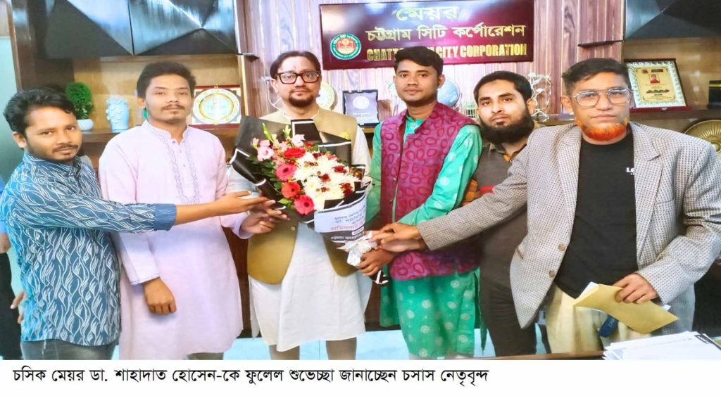 চট্টগ্রাম সিটি কর্পোরেশনের নবগত মেয়র ডা. শাহাদাত হোসেনের সঙ্গে সৌজন্য সাক্ষাৎ করেছেন চট্টগ্রাম সাংবাদিক সংস্থা (চসাস) এর একটি প্রতিনিধি দল। রোববার দুপুরে চট্টগ্রাম সিটি করপোরেশনের টাইগারপাসস্থ অস্থায়ী নগর ভবনে মেয়রের অফিস কক্ষে এই সৌজন্য সাক্ষাত হয়। এ সময় চসাস নেতৃবৃন্দ মেয়রকে ফুল দিয়ে শুভেচ্ছা বিনিময় করে। এ সময় মেয়র বলেন, সব শ্রেণি-পেশার প্রতিনিধিদের যৌক্তিক পরামর্শ-মতামত নিয়ে আমি নগরবাসীর সেবা দিতে আন্তরিক প্রত্যয়ী। এই নগরী আমার একার নয়, সবার। আমি নগর পিতা নই, সেবক।আমি চট্টগ্রামকে হেলদি সিটি হিসেবে গড়ে তোলার ক্ষেত্রে বিশেষ মনোযোগ দিচ্ছি। স্বাস্থ্য বিভাগকে ঢেলে সাজানোর চেষ্টা করছি। তিনি বলেন, সাংবাদিকরা সমাজের দর্পণ, যারা আমাদের পথ দেখায় এবং সত্যের আলোকে সমাজকে উদ্ভাসিত করে। আপনাদের মূল্যবান পরামর্শ ও সহযোগিতার মাধ্যমে আমি নগরবাসীর জন্য সেবার মান আরও উন্নত ও কার্যকর করতে প্রতিশ্রুতিবদ্ধ। চসাসের পক্ষে সাধারণ সম্পাদক ওসমান এহতেসাম মেয়রকে অভিনন্দন জানিয়ে বলেন, চট্টগ্রামকে আধুনিক ও পরিকল্পিত নগরী হিসেবে গড়ে তুলতে সাংবাদিক সমাজ জনগণের নির্বাচিত মেয়র ডা. শাহাদাত হোসেনের পাশে থাকবে। নাগরিক সমাজের স্বার্থে এবং জনকল্যাণে মেয়রের সব ভালো কাজে আমাদের সমর্থন থাকবে। চসাসের পক্ষে আরো উপস্থিত ছিলেন, মোঃ ফিরোজ উদ্দিন, গাজী গোফরান, মোঃ জাহাঙ্গীর আলম, মোঃ নিজাম উদ্দিন সহ প্রমুখ।