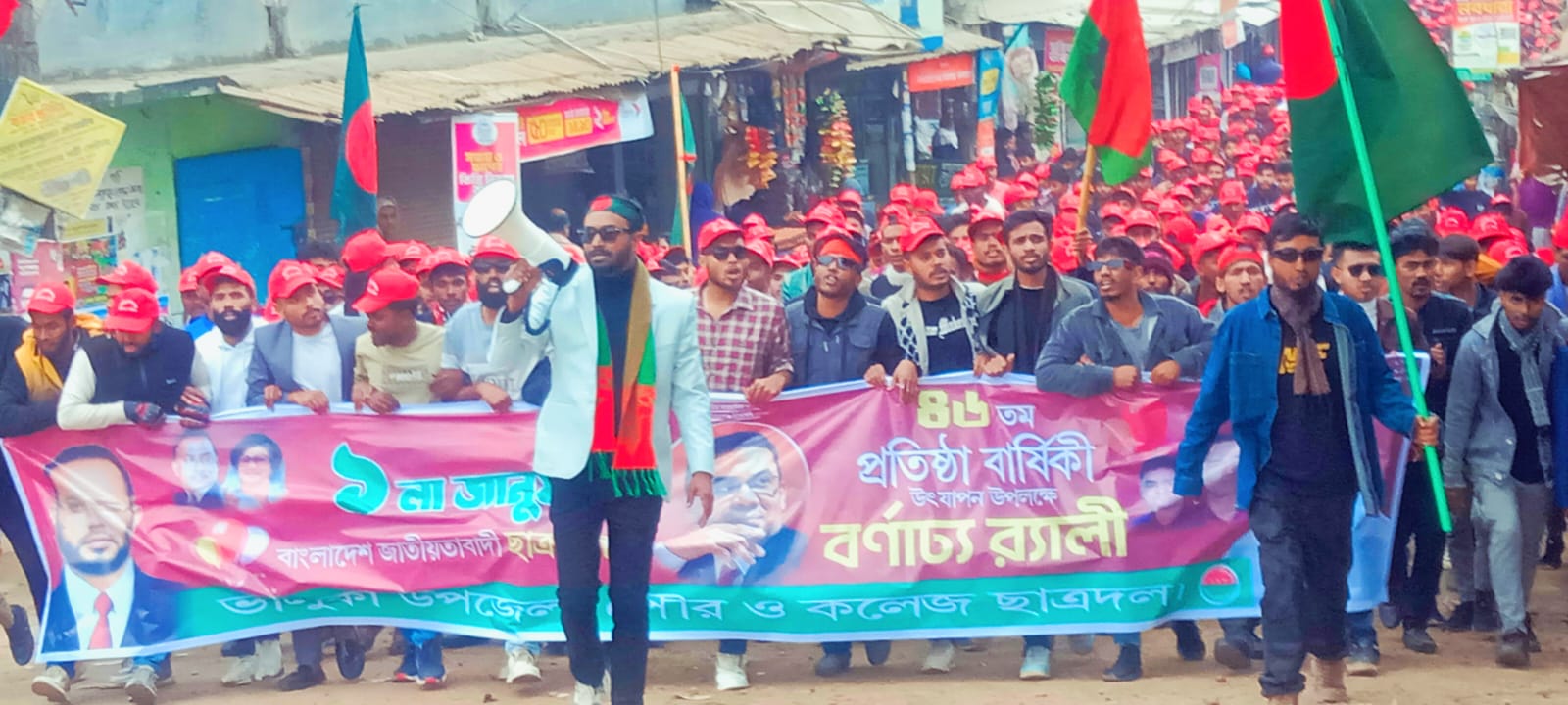 ময়মনসিংহের ভালুকায় ছাত্রদলের ৪৬তম প্রতিষ্ঠা বার্ষিকী উপলক্ষে উপজেলা ছাত্রদল, পৌর ছাত্রদল ও কলেজ ছাত্রদলের উদ্যোগে বৃহস্পতিবার দুপুরে বর্ণাঢ্য মিছিল বের হয়। মিছিলটিতে নেতৃত্ব দেন পৌর ছাত্রদলের সাবেক সদস্য সচিব আদি খান সাকিল। মিছিলটি ভালুকা বাসস্ট্যান্ড সংলগ্ন সালাহ উদ্দিন টাওয়ার থেকে বের হয়ে ঢাকা-ময়মনসিংহ মহাসড়ক প্রদক্ষিন শেষে পুনরায় দলীয় কার্যালয়ে গিয়ে শেষ হয়। এছাড়াও উপস্থিত ছিলেন, উপজেলা ছাত্রদল নেতা আবদুল্লাহ আল মামুন, তানবির আহাম্মেদ শরিফ, কালিম, সাকিল, আশিক পৌর ছাত্রদলের যুগ্ম আহবায়ক নয়ন মিয়া, সদস্য আদনান খান পলাশ, ছাত্রনেতা আরমান, নাইম, সাকিল, সানি, ফয়েজ, রাকিব, তুষার, কাজল ছাত্রদেলের যুগ্ম আহবায়ক আজমির আলম, সালমান শরিফ, মেদুয়ারী ইউনিয়ন ছাত্রদল নেতা মিনহাজ, রুহুল, কাইয়ুম, জিয়া, উথুরা ইউনিয়ন ছাত্রদল নেতা সিয়াম, ভরাডোবা ইউনিয়ন ছাত্রদল নেতা মোফাস্সেল, সাব্বির, সাদেক, বিরুনীয়া ইউনিয়ন ছাত্রদল নেতা