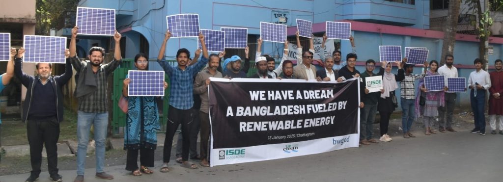 বেসরকারী উন্নয়ন সংস্থা আইএসডিই বাংলাদেশ, কোস্টাল লাইভলিহুড অ্যান্ড এনভায়রনমেন্টাল অ্যাকশন নেটওয়ার্ক(ক্লিন), এবং বাংলাদেশ ওয়ার্কিং গ্রুপ অন ইকোলজি অ্যান্ড ডেভলপমেন্ট (বিডব্লিউজিইডি) এর যৌথ উদ্যোগে আজ চট্টগ্রামে নতুন বছরে নতুন প্রত্যাশা নিয়ে নবায়নযোগ্য শক্তির দাবিতে বিশেষ প্রচারণা কর্মসূচি অনুষ্ঠিত হয়েছে। ক্যাম্পেইনটির মূল প্রতিপাদ্য ছিল “নতুন বছরে, নতুন প্রত্যাশাঃ জীবাশ্ম জ্বালানির পরিবর্তে নবায়নযোগ্য জ্বালানির স্বপ্ন দেখি”।