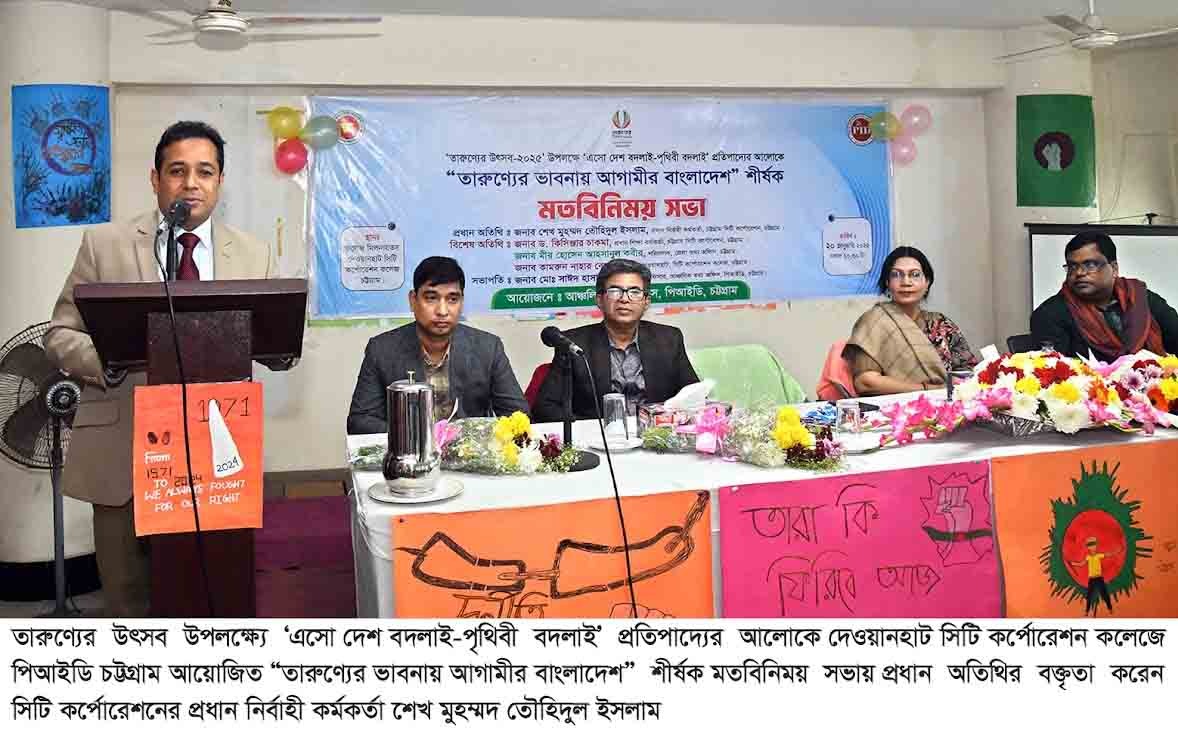 তারুন্যের উৎসব-২০২৫ উদযাপন উপলক্ষ্যে আঞ্চলিক তথ্য অফিস, পিআইডি চট্টগ্রামের উদ্যোগে নগরীর দেওয়ানহাট সিটি কর্পোরেশন কলেজ মিলনায়তনে এসো দেশ বদলাই-পৃথিবী বদলাই প্রতিপাদ্যের আলোকে ‘তারুণ্যের ভাবনায় আগামীর বাংলাদেশ’ শীর্ষক