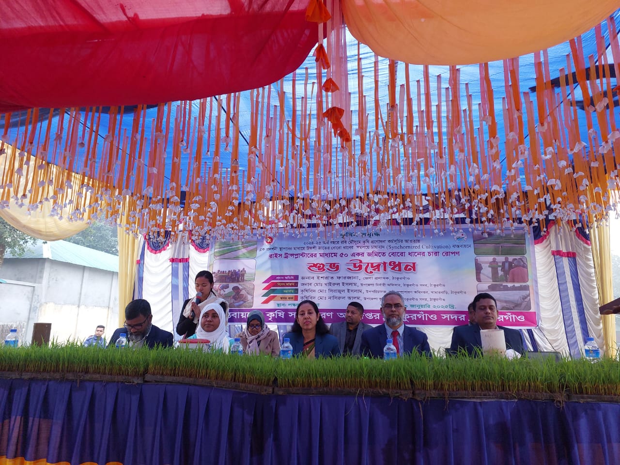 ঠাকুরগাঁও সদর উপজেলার গড়েয়ার লস্করা গ্রামে ২০২৪-২৫ অর্থবছরের রবি মৌসুমে কৃষি প্রণোদনা কর্মসূচির আওতায় রবি মৌসূমে উফশী জাতের বোরো ধানের সমলয়ে চাষাবাদের (সিনক্রোনাইজড কালটিভিশন) বাস্তবায়নে রাইস ট্রান্সপ্লান্টারের মাধ্যমে ৫০ একর জমিতে বোরো ধানের চারা রোপণ ও শুভ উদ্বোধন অনুষ্ঠিত।