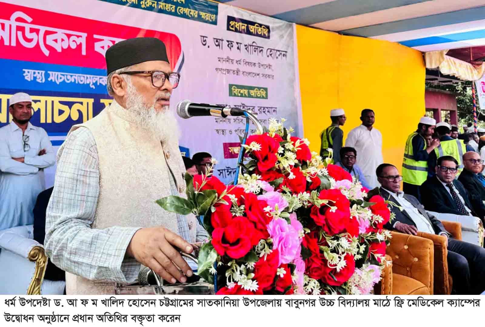 ধর্ম উপদেষ্টা ড. আ ফ ম খালিদ হোসেন বলেছেন, জনগণের সেবা করা অত্যন্ত গৌরবের। এটি সওয়াবেরও কাজ। সোমবার সকালে চট্টগ্রামের সাতকানিয়া উপজেলার মাদার্শা ইউনিয়নের বাবুনগর উচ্চ বিদ্যালয় মাঠে ফ্রি মেডিকেল ক্যাম্পের উদ্বোধন অনুষ্ঠানে প্রধান অতিথির বক্তৃতায় তিনি এসব কথা বলেন। নুরে হাবিব ওয়েলফেয়ার ফাউন্ডেশন এ মেডিকেল ক্যাম্প আয়োজন করে। নুরে হাবিব ওয়েলফেয়ার ফাউন্ডেশনের চেয়ারম্যান চট্টগ্রাম বিশ্ববিদ্যালয়ের আইন বিভাগের সহযোগী অধ্যাপক সাঈদ আহসান খালিদের সভাপতিত্বে এ অনুষ্ঠানে বিশেষ অতিথির বক্তৃতা Chip স্বাস্থ্যসেবা বিভাগের সচিব মোঃ সাইদুর রহমান।