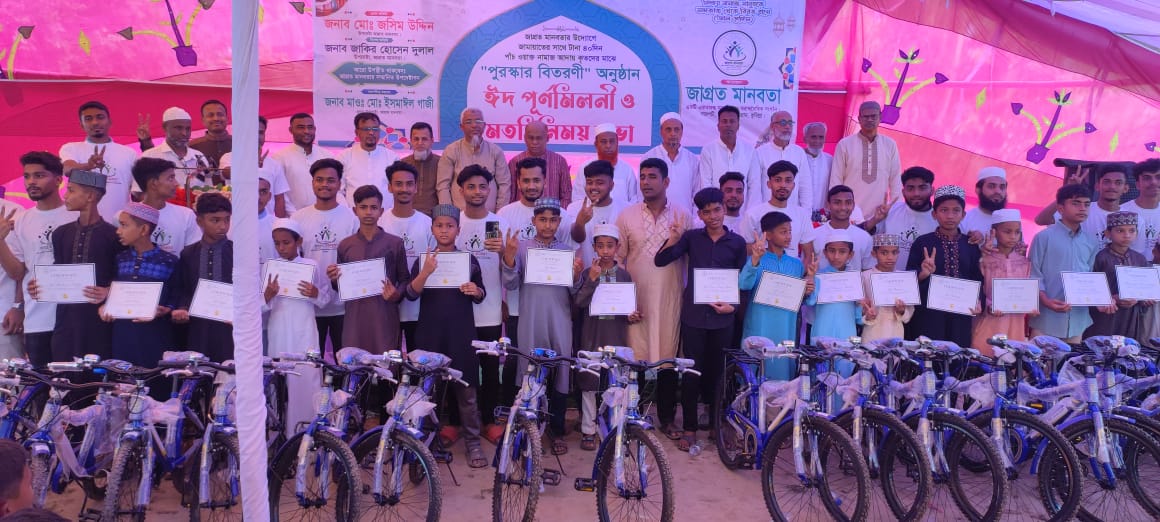 জাগ্রত মানবতা উপদেষ্টা জয়নাল আবেদীন স্বাগত বক্তব্যে বলেন, ১০ বছরের শিশু থেকে ২২ বছরের কিশোররা ৪০ দিন ৫ ওয়াক্ত নামাজ জামাতের সাথে আদায় করে, তাদের প্রত্যেককে একটি করে বাইসাইকেল পুরস্কার দেওয়া হয়েছে। তাদের মধ্য থেকে ৪০ দিন জামাতে নামাজ পড়াদের যাচাই-বাছাই করে ৩৬জনকে বাই সাইকেল এবং বাকি ১২ জনকে স্কুল ব্যাগ পুরস্কার প্রদান করা হয়েছে।