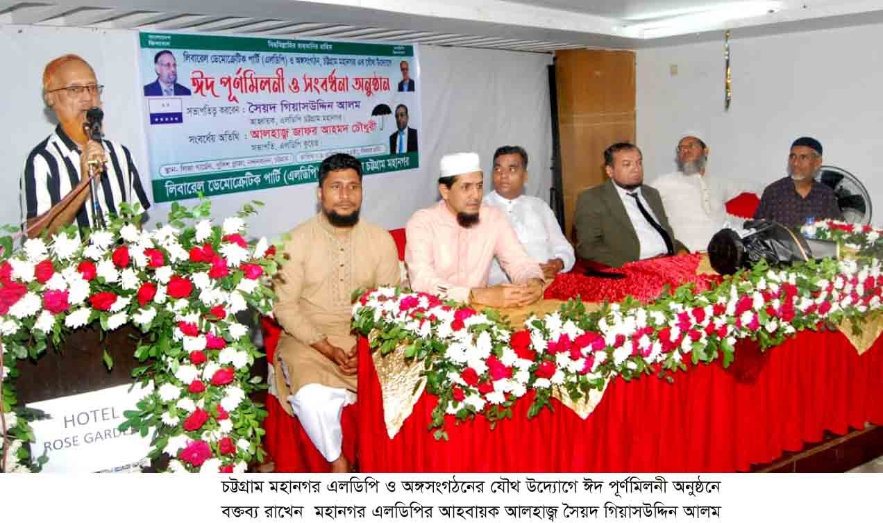 লিবারেল ডেমোক্রেটিক পার্টি (এলডিপি) চট্টগ্রাম মহানগর ও অঙ্গসংগঠনের যৌথ উদ্যোগে ঈদ পূর্ণমিলনী ও সংবর্ধনা অনুষ্ঠান বিকেলে নন্দনকানন পুলিশ প্লাজাস্থ লিজা গার্ডেনে সম্পন্ন হয়েছে। অনুষ্ঠানে সভাপতিত্ব করেন চট্টগ্রাম মহানগর এলডিপির আহবায়ক, রিাজনীতিবিদ ও শিক্ষাবিদ, কর্মী বান্ধব রাজনৈতিক সংগঠক, জননেতা আলহাজ্ব সৈয়দ গিয়াসউদ্দিন আলম। তিনি বলেন, ঈদ গত ১৫ বছরে খুশি নিয়ে আসতে পারেনি এলডিপি নেতাদের পরিবারে। বরং ঈদ এলে তাদের ওপর নেমে আসত আরও বেশি গ্রেফতার ও হয়রানির খড়্গ। ফ্যাসিবাদ পতনের পর এবার মুক্ত পরিবেশে স্বস্তির ঈদ এলডিপি নেতাদের। এবার মুক্ত পরিবেশে ঈদ উদযাপন রাজনীতিতে সক্রিয় হয়ে উঠেছে এলডিপির নেতাকর্মীরা। এ ধারা অব্যাহত রাখতে নেতাকর্মীদের আহবান জানান। সংবর্ধেয় অতিথি ছিলেন, বিশিষ্ট ব্যবসায়ী ও সামাজিক উদোক্তা, দানবীর, কুয়েত এলডিপির সভাপতি আলহাজ্ব জাফর আহমদ চৌধুরী। গণতান্ত্রিক যুবদল চট্টগ্রাম মহানগরের ভারপ্রাপ্ত সাধারণ সম্পাদক করিম মিয়ার প্রাণবন্ত সঞ্চালনায় বিশেষ অতিথি ছিলেন, চট্টগ্রাম মহানগর আহবায়ক কমিটির সদস্য ও গনতান্ত্রিক উলামা দলের সভাপতি মাওলানা মোহাম্মদ শাহ আলম আলকাদেরি, কোতোয়ালি থানা এলডিপির সভাপতি মো. আবু সৈয়দ, মহানগর উলামা দলের সাধারণ সম্পাদক হাফেজ মোহাম্মদ আবুল হায়াত নক্সবন্দী, গনতান্ত্রিক যুবদলের সাংগঠনিক সম্পাদক মোহাম্মদ নুরুল আমিন, বায়েজিদ বোস্তামী থানা এলডিপির প্রবীণ নেতা মোহাম্মদ আলি। বক্তব্য রাখেন, মহানগর গণতান্ত্রিক ছাত্রদলের সভাপতি মোহাম্মদ ফরহাদ, মওলানা জাহেদুল ইসলাম, একে নয়ন, মোহাম্মদ দেলোয়ার, হারুন হায়দার, মোহাম্মদ সেলিম, মোহাম্মদ আসলাম, মোহাম্মদ মাসুদ,মোহাম্মদ ইউসুফ, মোহাম্মদ সাদ্দাম, মোঃ ফরিদুর রহমান (দিপু) আব্দুল নবী, মো. আব্দুর রাজ্জাক মোঃ রুবেল, মোহাম্মদ কাউসার, মোহাম্মদ ফোরকান, মো. শফিক, মো. ফারুক প্রমুখ।