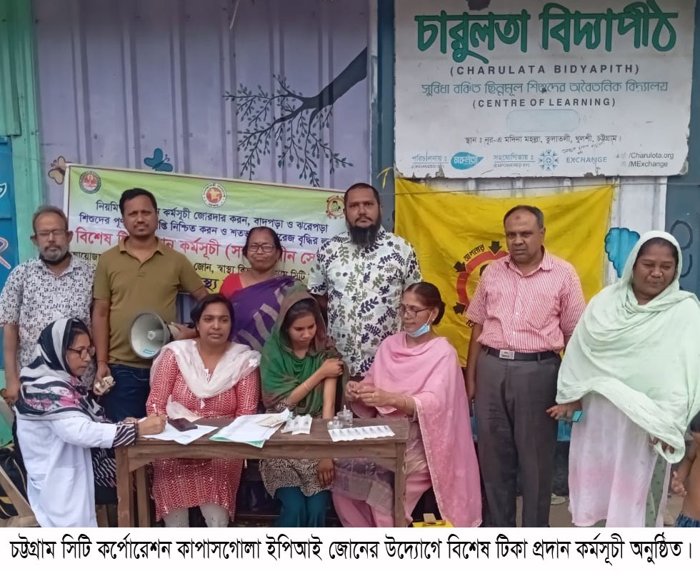 চট্টগ্রাম সিটি কর্পোরেশনের স্বাস্থ্য বিভাগের প্রধান স্বাস্থ্য কর্মকর্তা ডাক্তার মোহাম্মদ ইমাম হোসেন রানা ও স্বাস্থ্য কর্মকর্তা ডাক্তার তপন কুমার চক্রবর্তীর নির্দেশনায় কাপাসগোলা ইপিআই জোনের উদ্যোগে বিশেষ টিকাদান কর্মসূচী সন্ধ্যাকালীন সেশান বিশ্বস্বাস্থ্য সংস্থা ও ইউনিসেফ এবং ইমেজ নাসিরাবাদ ক্লিনিকের সহযোগিতায় অনুষ্ঠিত হয়। ইমেজ নাসিরাবাদ ক্লিনিকের আওতাধীন ৮নং ওয়ার্ডে পূর্ব নাসিরাবাদ তুলাতুলি, রেললাইন কলোনি, চারুলতা বিদ্যাপীঠ, ষোলশহর, বেবিসুপার মার্কেট,