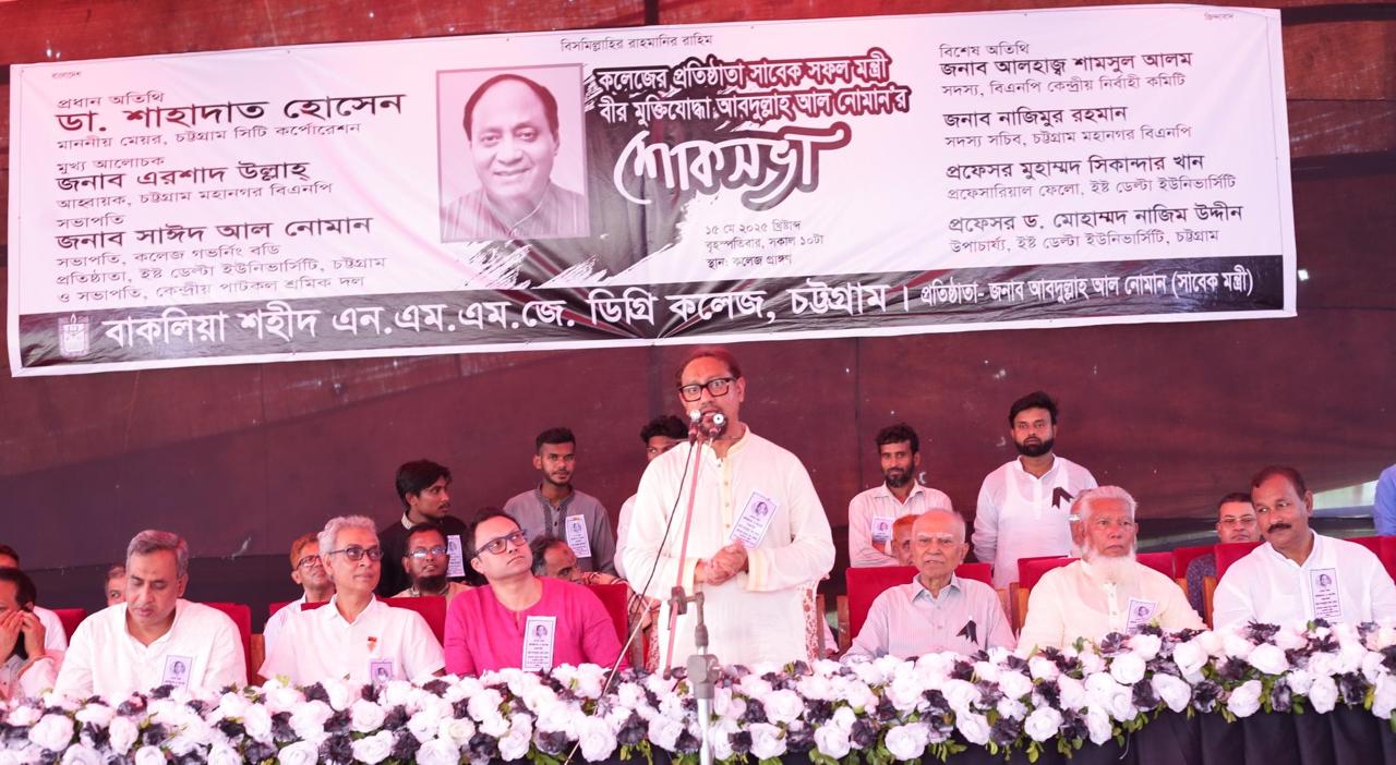 চট্টগ্রাম সিটি কর্পোরেশনের মেয়র ডা. শাহাদাত হোসেন বলেছেন, চট্টগ্রাম তথা দেশের রাজনৈতিক, শিক্ষা ও স্বাস্থ্য খাতে প্রয়াত জননেতা আব্দুল্লাহ আল নোমান যে অবদান রেখেছেন, তা চিরস্মরণীয় হয়ে থাকবে। আবদুল্লাহ আল নোমান চট্টগ্রামের উন্নয়নের এক উজ্জ্বল দৃষ্টান্ত। তিনি বৃহস্পতিবার (১৫ মে) বাকলিয়া শহীদ এনএমএমজে ডিগ্রি কলেজ প্রাঙ্গণে কলেজের প্রতিষ্ঠাতা সাবেক মন্ত্রী বীর মুক্তিযোদ্ধা আবদুল্লাহ আল নোমানের শোক সভায় প্রধান অতিথির বক্তব্যে এসব কথা বলেন।