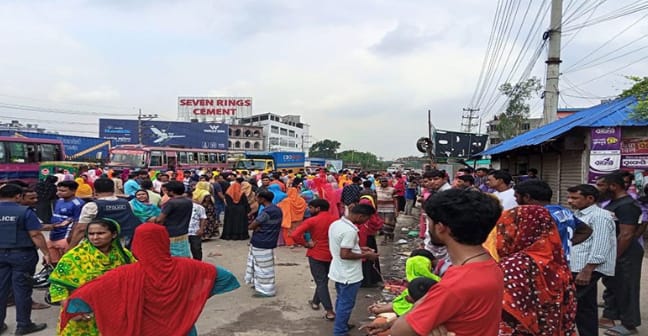 কালিয়াকৈরে বকেয়া বেতনের দাবিতে মহাসড়ক অবরোধ করে শ্রমিকদের বিক্ষোভ।