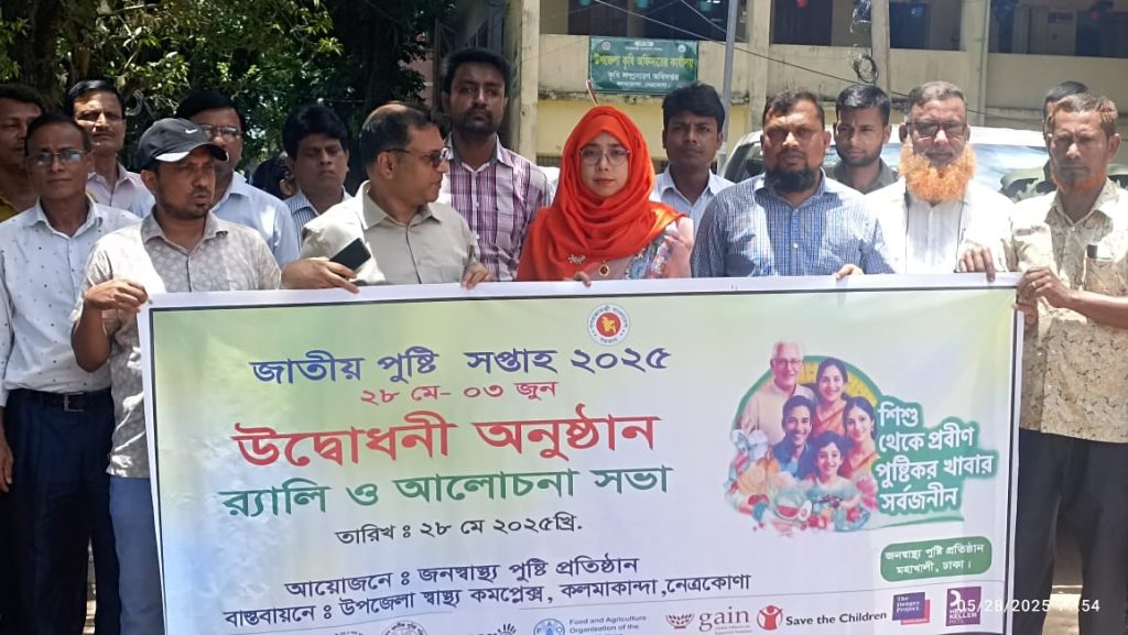শিশু থেকে প্রবীণ, পুষ্টিকর খাবার সবার অধিকার” — এই প্রতিপাদ্যকে সামনে রেখে নেত্রকোনার কলমাকান্দা উপজেলায় শুরু হয়েছে ‘জাতীয় পুষ্টি সপ্তাহ ২০২৫’। ২৮ মে থেকে ৩ জুন পর্যন্ত চলবে এই সপ্তাহব্যাপী কর্মসূচি।উদ্বোধনী দিনে উপজেলা স্বাস্থ্য কমপ্লেক্সের আয়োজনে এক বর্ণাঢ্য র‍্যালি ও আলোচনা সভার আয়োজন করা হয়।