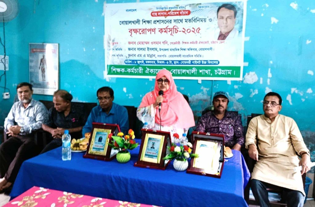 বোয়ালখালী ও রাঙ্গুনিয়া উপজেলা শিক্ষা অফিসার সালমা ইসলাম বলেছেন -শিক্ষকদের হৃত গৌরব পুনরুদ্ধারে সবাইকে এগিয়ে আসতে হবে, এতেই শিক্ষকরা শিক্ষাদানে আরো আন্তরিক হয়ে জাতি গঠনে সচেষ্ট হবে এর মধ্যে দিয়ে আমাদের আগামী প্রজন্ম বিশ্বায়নের চ্যালেন্জ মোকাবেলার সক্ষম হব।দেশ দ্রুত এগিয়ে যাবে কর্মচারী ঐক্যজোট বোয়ালখালী শাখা আয়োজিত শিক্ষার মানোন্নয়নে মতবিনিময় ও বৃক্ষরোপণ কর্মসূচি’২০২৫ উপলক্ষে আয়োজিত সভায় প্রধান অতিথির বক্তৃতায় উপরোক্ত বক্তব্য রাখেন তিনি। সংগঠনের সহ সভাপতি বাবুল কান্তি দাশের সভাপতিত্বে ও সদস্য সচিব মনজুর আলমের সঞ্চালনায় গোমদন্ডী পাইলট মডেল উচ্চ বিদ্যালয় প্রাঙ্গণে অনুষ্ঠিত এ অনুষ্ঠানে উদ্বোধক ছিলেন শিক্ষক- কর্মচারী ঐক্যজোট জেলা সেক্রেটারি অধ্যাপক মোঃ ওসমান গনি, বিশেষ অতিথি হিসেবে উপস্থিত ছিলেন বোয়ালখালী সাংবাদিক সমিতির সভাপতি সাংবাদিক এম এ মন্নান,অধ্যাপক কায়সারুল হক,প্রধান শিক্ষক এস এম খসরু পারভেজ,বক্তব্য রাখেন অধ্যাপিকা সাবেরা শারমিন,আরেফা খানম,প্রভাষক মিজানুর রহমান,বাবর উদ্দিন,মনসুর আলী,ইয়াছিন চৌধুরী, মোঃ