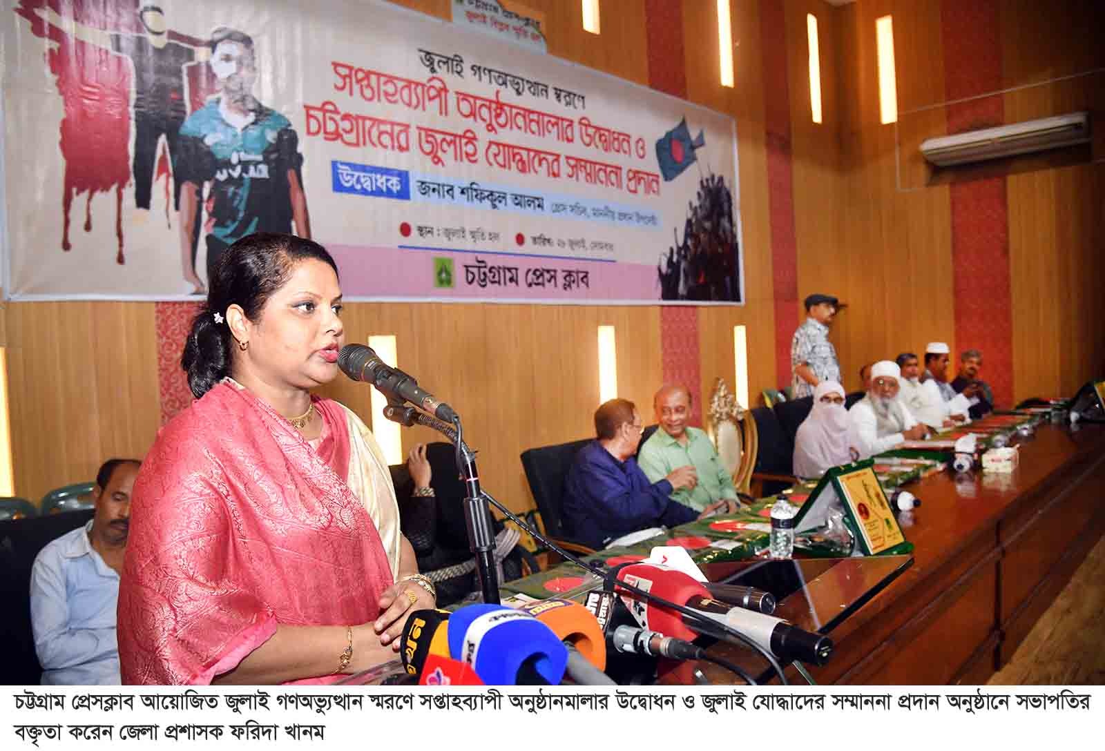 চট্টগ্রামে ২০২৪ আন্দোলনে শহিদ পরিবার ও জুলাই যোদ্ধাদের সম্মাননা দিয়েছে চট্টগ্রাম প্রেসক্লাব। এছাড়া জুলাই গণঅভ্যুত্থান স্মরণে আয়োজন করেছে সপ্তাহব্যাপী বিশেষ অনুষ্ঠানমালার। অনুষ্ঠানমালার মধ্যে রয়েছে তারুণ্যের ভূমিকা, বর্তমান প্রজন্মের ভাবনা, ফটো প্রদর্শনী, জুলাই যোদ্ধাদের সম্মাননা, অভিজ্ঞতা বিনিময়, সাংবাদিকদের ভূমিকা, আইনী বিশ্লেষণ প্রভৃতি।
